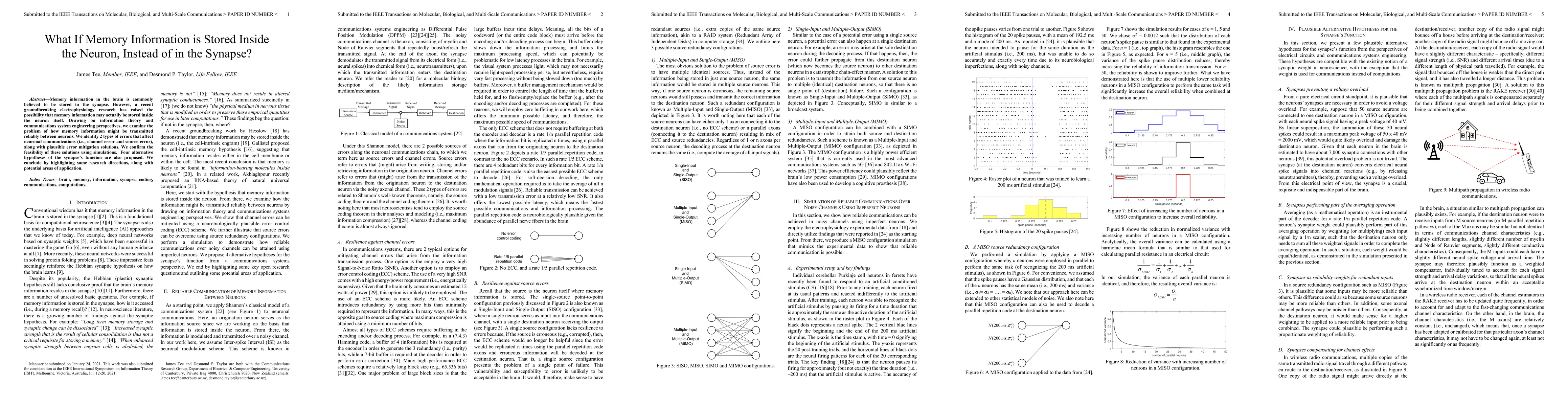 This paper explores the novel hypothesis that memory information may be stored within neurons rather than in synapses, supported by electrophysiology research. It identifies and proposes solutions for potential errors in neuronal communication and suggests four alternative functions for synapses, concluding with implications for future research and applications.