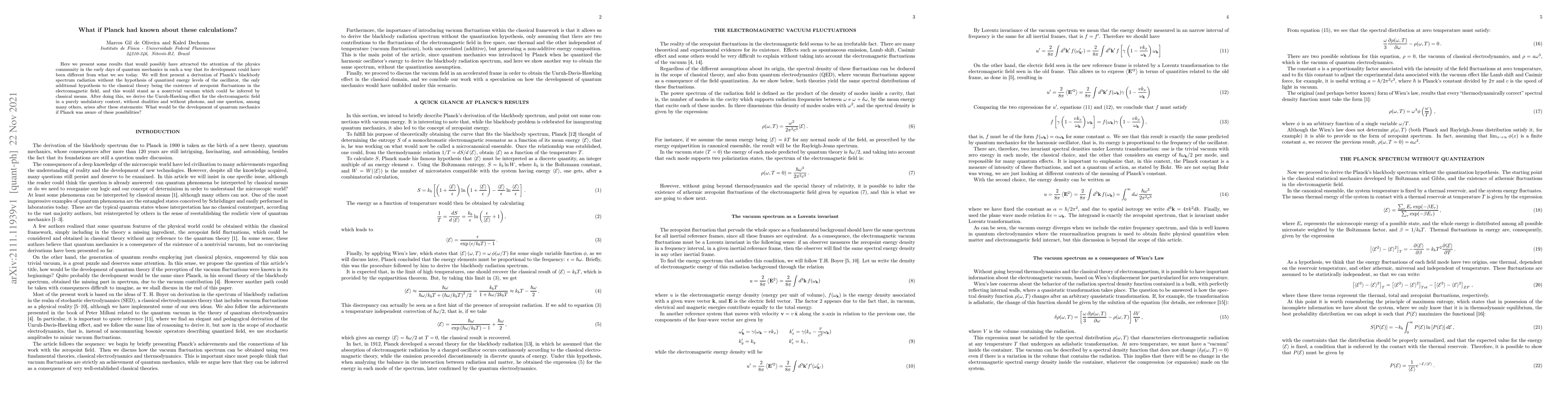 Here we present some results that would possibly have attracted the attention of the physics community in the early days of quantum mechanics in such a way that its development could have been different from what we see today. We will first present a derivation of Planck's blackbody spectrum radiation without the hypothesis of quantized energy levels of the oscillator, the only additional hypothesis to the classical theory being the existence of zeropoint fluctuations in the electromagnetic field, and this would stand as a nontrivial vacuum which could be inferred by classical means. After doing this, we derive the Unruh-Hawking effect for the electromagnetic field in a purely undulatory context, without dualities and without photons, and one question, among many others, arises after these statements: What would be the development of quantum mechanics if Planck was aware of these possibilities?