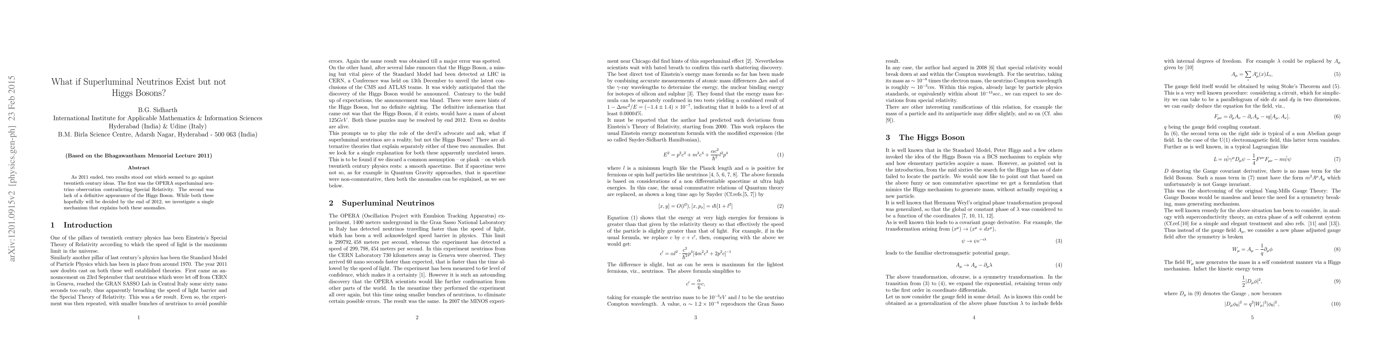 This paper explores a mechanism that could explain both the OPERA superluminal neutrino observation and the lack of Higgs Boson detection, offering an alternative to current understanding of physics.
