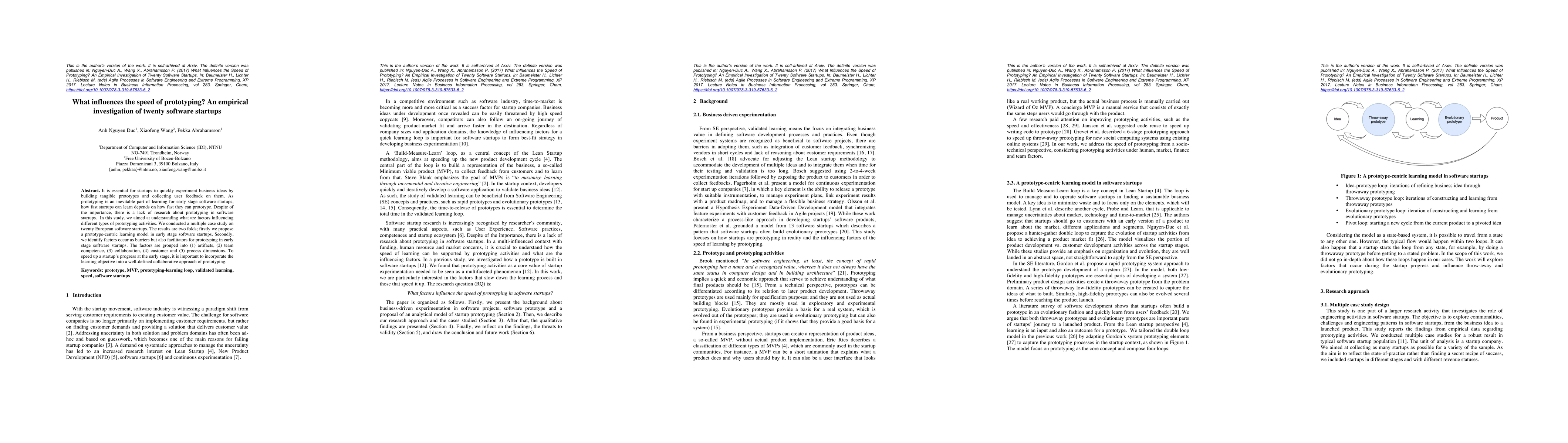 This study explores factors influencing the speed of prototyping in twenty European software startups, identifying barriers and facilitators grouped into artifacts, team competence, collaboration, customer, and process dimensions. The research proposes a prototype-centric learning model and emphasizes the importance of a collaborative approach for faster startup progress.