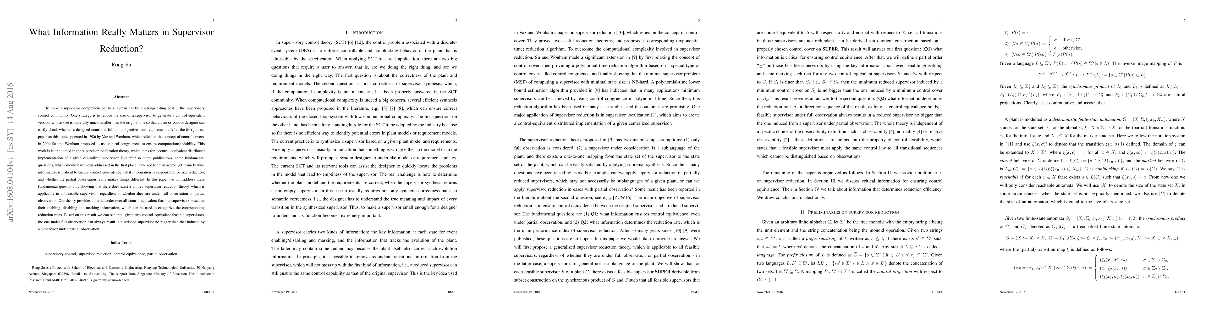 To make a supervisor comprehensible to a layman has been a long-lasting goal in the supervisory control community. One strategy is to reduce the size of a supervisor to generate a control equivalent version, whose size is hopefully much smaller than the original one so that a user or control designer can easily check whether a designed controller fulfils its objectives and requirements. After the first journal paper on this topic appeared in 1986 by Vaz and Wonham, which relied on the concept of control covers, in 2004 Su and Wonham proposed to use control congruences to ensure computational viability. This work is later adopted in the supervisor localization theory, which aims for a control equivalent distributed implementation of a given centralized supervisor. But after so many publications, some fundamental questions, which should have been addressed in the first place, have not been answered yet, namely what information is critical to ensure control equivalence, what information is responsible for size reduction, and whether the partial observation really makes things different. In this paper we will address these fundamental questions by showing that there does exist a unified supervisor reduction theory, which is applicable to all feasible supervisors regardless of whether they are under full observation or partial observation. Our theory provides a partial order over all control equivalent feasible supervisors based on their enabling, disabling and marking information, which can be used to categorize the corresponding reduction rates. Based on this result we can see that, given two control equivalent feasible supervisors, the one under full observation can always result in a reduced supervisor no bigger than that induced by a supervisor under partial observation.
