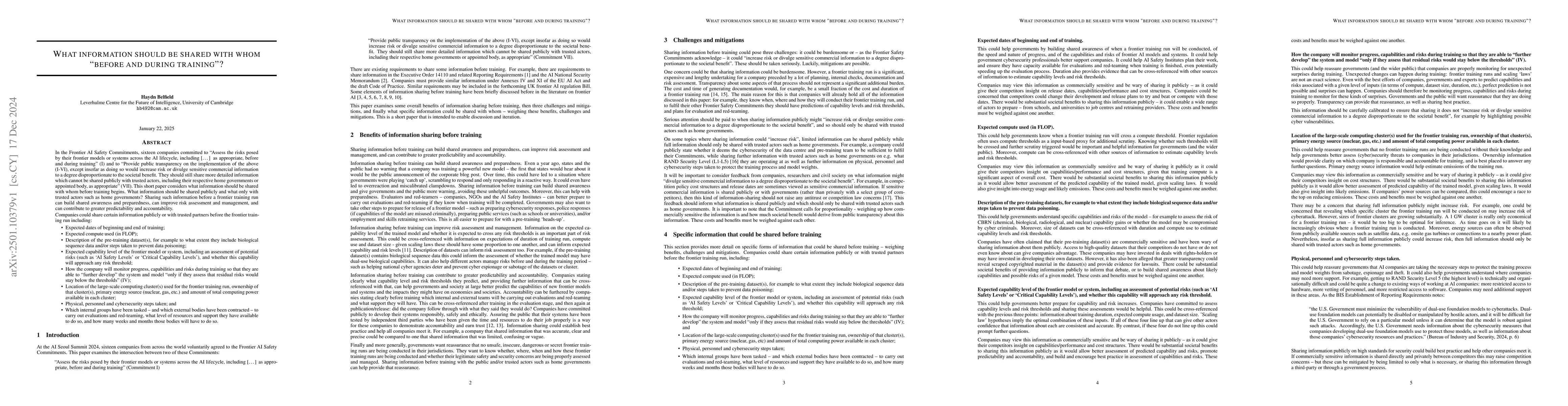 In the Frontier AI Safety Commitments, sixteen companies committed to "Assess the risks posed by their frontier models or systems across the AI lifecycle, including [...] as appropriate, before and during training" (I) and to "Provide public transparency on the implementation of the above (I-VI), except insofar as doing so would increase risk or divulge sensitive commercial information to a degree disproportionate to the societal benefit. They should still share more detailed information which cannot be shared publicly with trusted actors, including their respective home governments or appointed body, as appropriate" (VII). This short paper considers what information should be shared with whom before training begins. What information should be shared publicly and what only with trusted actors such as home governments? Sharing such information before a frontier training run can build shared awareness and preparedness, can improve risk assessment and management, and can contribute to greater predictability and accountability. Companies could share certain information before a training run including: Expected dates of beginning and end of training; Expected compute used (in FLOP); Description of the pre-training dataset(s); Expected capability level of the frontier model or system, including an assessment of potential risks and whether this capability will approach any risk threshold; How the company will monitor progress, capabilities and risks during training; Location, ownership, primary energy source of the large-scale computing cluster(s); Physical, personnel and cybersecurity steps taken; and Which internal and external groups have been tasked to carry out evaluations and red-teaming and what level of resources, support and time they have available to do so.