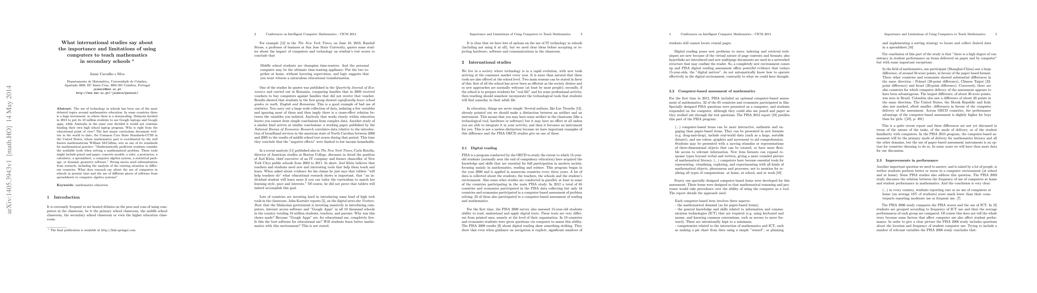 The use of technology in schools has been one of the most debated topics around mathematics education. In some countries there is a huge investment, in others there is a down-scaling. Malaysia decided in 2013 to put its 10 million students to use Google laptops and Google apps, while Australia in the same year decided it would not continue funding their own high school laptop program. Who is right from the educational point of view? The last major curriculum document written in the world to date, the Common Core State Standards (CCSS) in the United States, whose mathematics part is coordinated by the well known mathematician William McCallum, sets as one of its standards for mathematical practice: "Mathematically proficient students consider the available tools when solving a mathematical problem. These tools might include pencil and paper, concrete models, a ruler, a protractor, a calculator, a spreadsheet, a computer algebra system, a statistical package, or dynamic geometry software." Strong moves need substantiation from research, including the analysis of the existing situation in different countries. What does research say about the use of computers in schools in present time and the use of different pieces of software from spreadsheets to computer algebra systems?