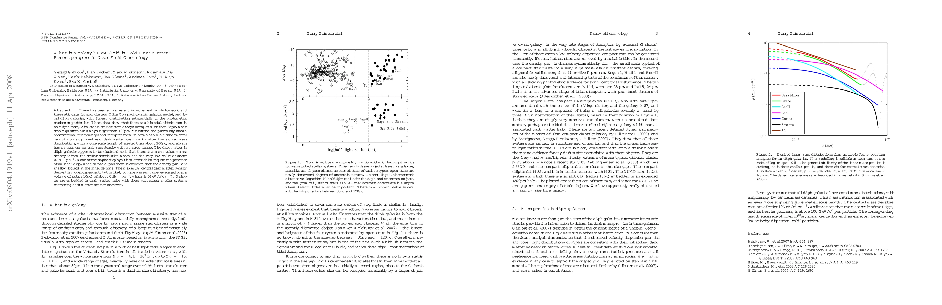 There has been a vast recent improvement in photometric and kinematic data for star clusters, Ultra Compact dwarfs, galactic nuclei, and local dSph galaxies, with Subaru contributing substantially to the photometric studies in particular. These data show that there is a bimodal distribution in half-light radii, with stable star clusters always being smaller than 35pc, while stable galaxies are always larger than 120pc. We extend the previously known observational relationships and interpret them in terms of a more fundamental pair of intrinsic properties of dark matter itself: dark matter forms cored mass distributions, with a core scale length of greater than about 100pc, and always has a maximum central mass density with a narrow range. The dark matter in dSph galaxies appears to be clustered such that there is a mean volume mass density within the stellar distribution which has the very low value of about 0.1$M_{\odot}$ pc$^{-3}$. None of the dSphs displays kinematics which require the presence of an inner cusp, while in two dSphs there is evidence that the density profile is shallow (cored) in the inner regions. The maximum central dark matter density derived is model dependent, but is likely to have a mean value (averaged over a volume of radius 10pc) of about 0.1$M_{\odot}$ pc$^{-3}$, which is 5GeV/c$^2$cm$^{-3}$). Galaxies are embedded in dark matter halos with these properties; smaller systems containing dark matter are not observed.