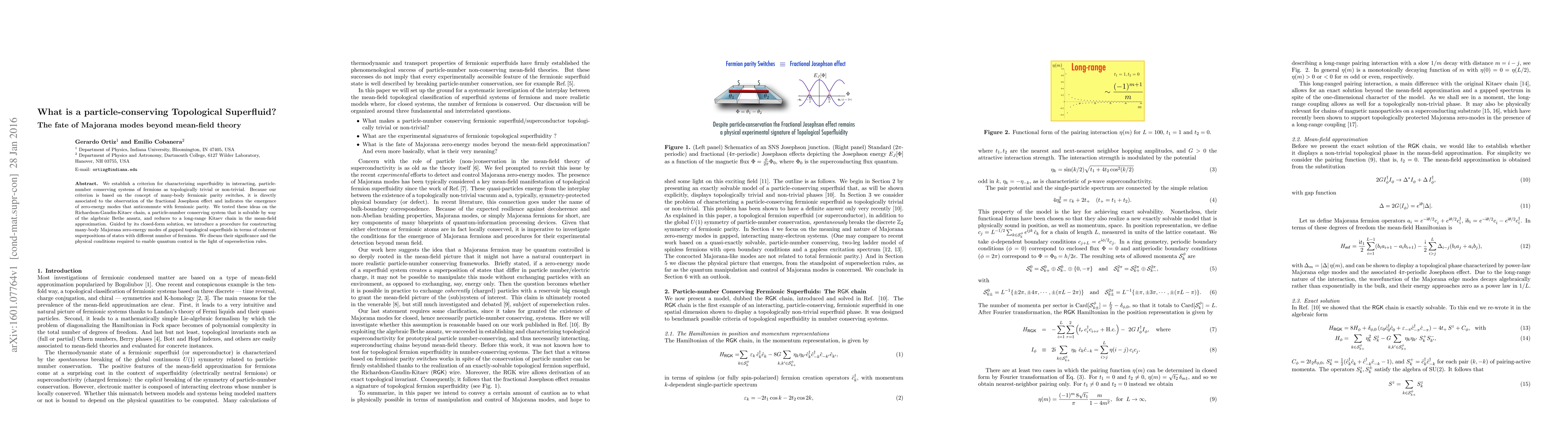 This paper establishes a criterion for identifying topological superfluidity in particle-number conserving fermion systems, based on many-body fermionic parity switches. It demonstrates the fractional Josephson effect and constructs Majorana zero-energy modes in the Richardson-Gaudin-Kitaev chain, discussing their implications for quantum control.