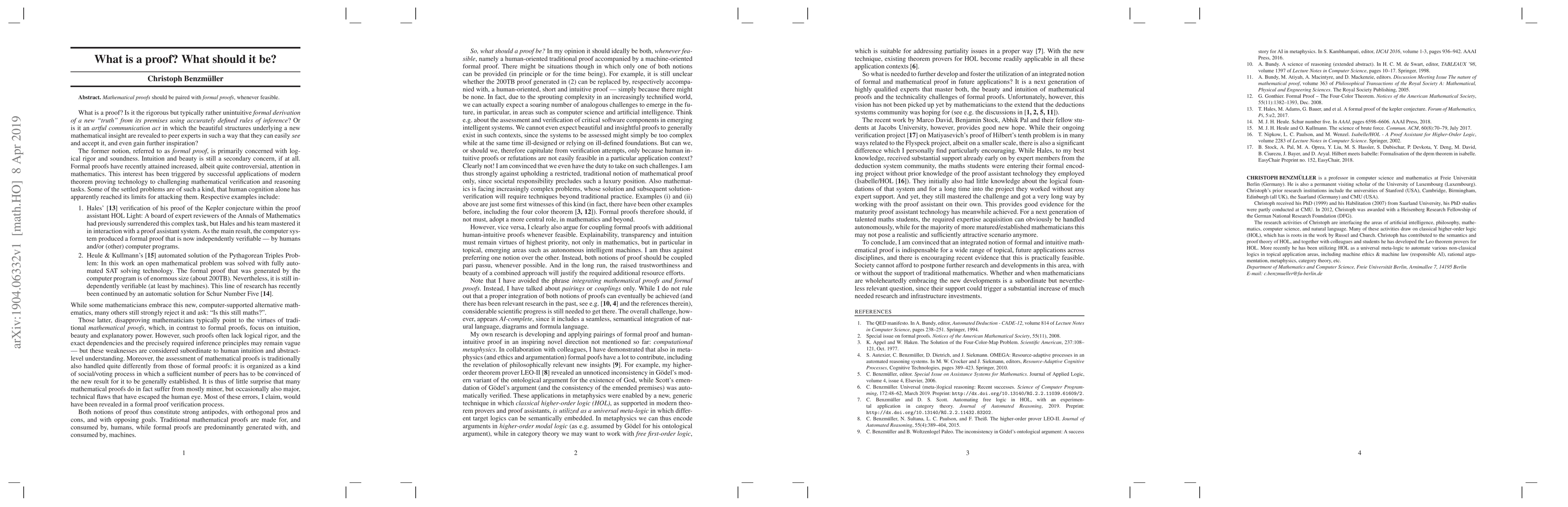 Summary: This paper argues for the integration of formal proofs with traditional mathematical proofs to enhance rigor and clarity in mathematical reasoning. The author emphasizes the importance of formal proofs whenever possible to ensure precision and unambiguous understanding in mathematics.