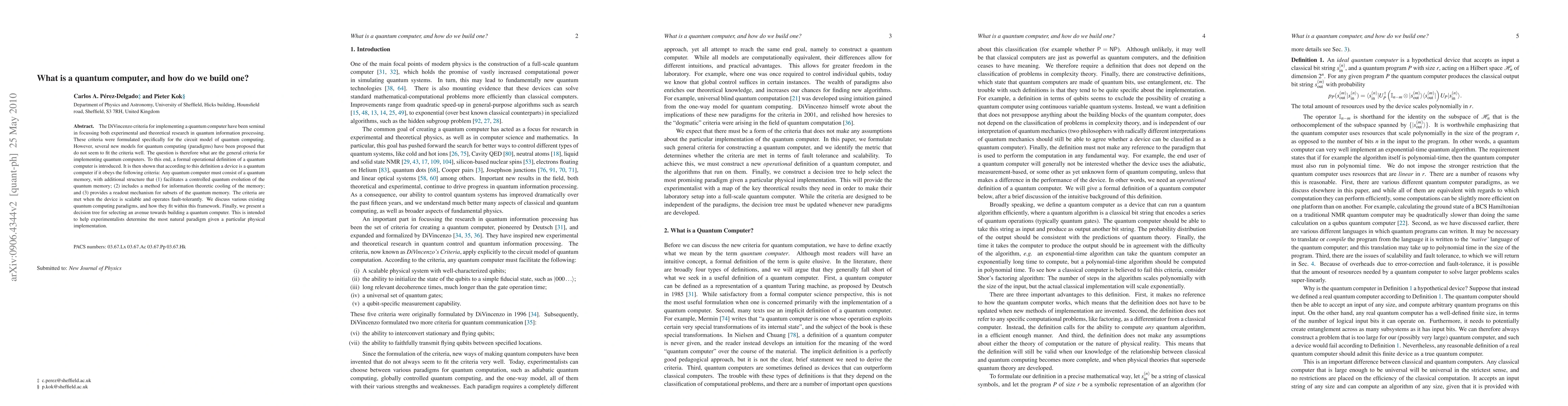 The DiVincenzo criteria for implementing a quantum computer have been seminal in focussing both experimental and theoretical research in quantum information processing. These criteria were formulated specifically for the circuit model of quantum computing. However, several new models for quantum computing (paradigms) have been proposed that do not seem to fit the criteria well. The question is therefore what are the general criteria for implementing quantum computers. To this end, a formal operational definition of a quantum computer is introduced. It is then shown that according to this definition a device is a quantum computer if it obeys the following four criteria: Any quantum computer must (1) have a quantum memory; (2) facilitate a controlled quantum evolution of the quantum memory; (3) include a method for cooling the quantum memory; and (4) provide a readout mechanism for subsets of the quantum memory. The criteria are met when the device is scalable and operates fault-tolerantly. We discuss various existing quantum computing paradigms, and how they fit within this framework. Finally, we lay out a roadmap for selecting an avenue towards building a quantum computer. This is summarized in a decision tree intended to help experimentalists determine the most natural paradigm given a particular physical implementation.