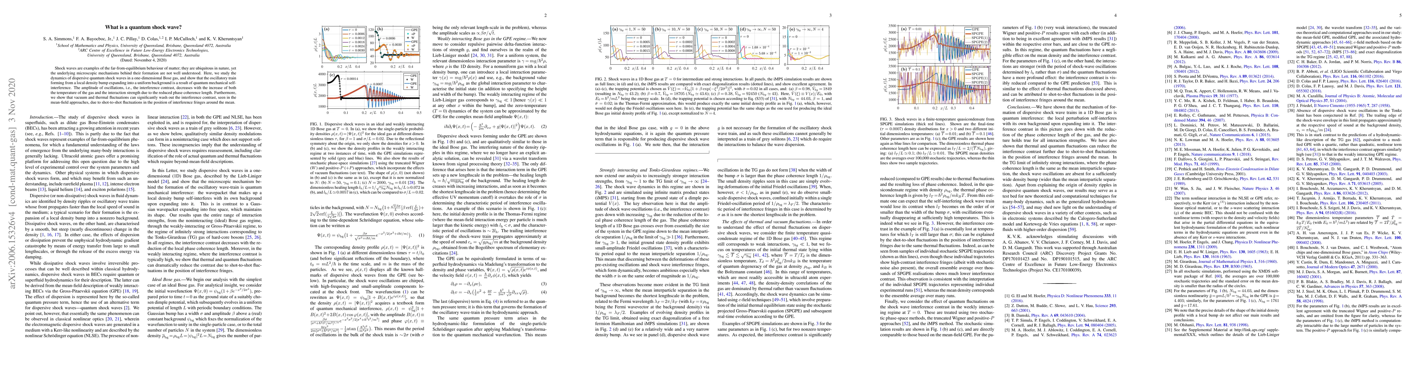 Shock waves are examples of the far-from-equilibrium behaviour of matter; they are ubiquitous in nature, yet the underlying microscopic mechanisms behind their formation are not well understood. Here, we study the dynamics of dispersive quantum shock waves in a one-dimensional Bose gas, and show that the oscillatory train forming from a local density bump expanding into a uniform background is a result of quantum mechanical self-interference. The amplitude of oscillations, i.e., the interference contrast, decreases with the increase of both the temperature of the gas and the interaction strength due to the reduced phase coherence length. Furthermore, we show that vacuum and thermal fluctuations can significantly wash out the interference contrast, seen in the mean-field approaches, due to shot-to-shot fluctuations in the position of interference fringes around the mean.