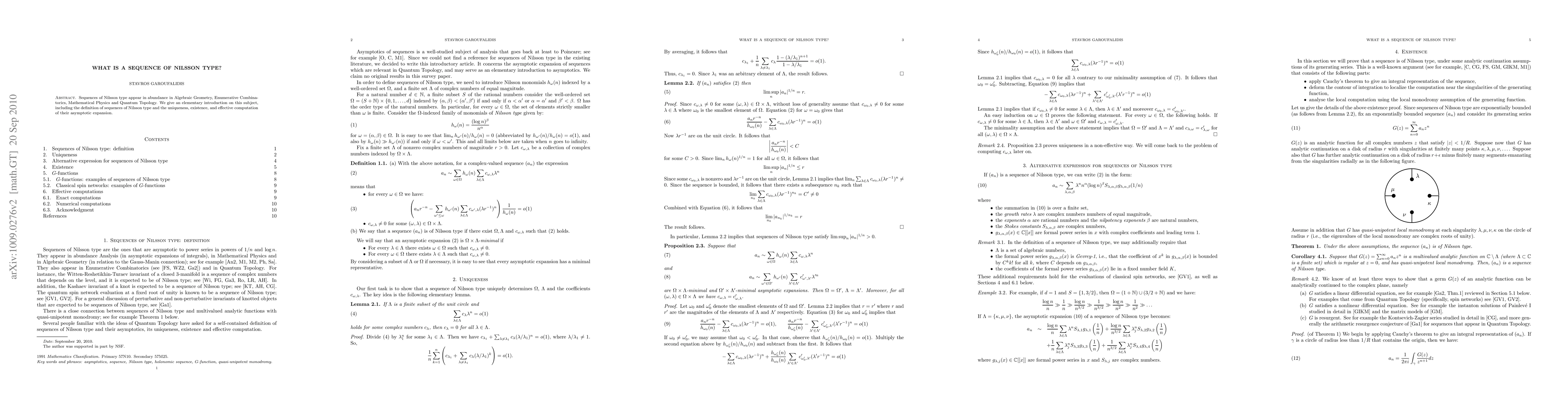 The paper provides an elementary introduction to sequences of Nilsson type, defining them and discussing their uniqueness, existence, and effective computation of asymptotic expansions. It uses techniques from Algebraic Geometry, Enumerative Combinatorics, Mathematical Physics, and Quantum Topology.