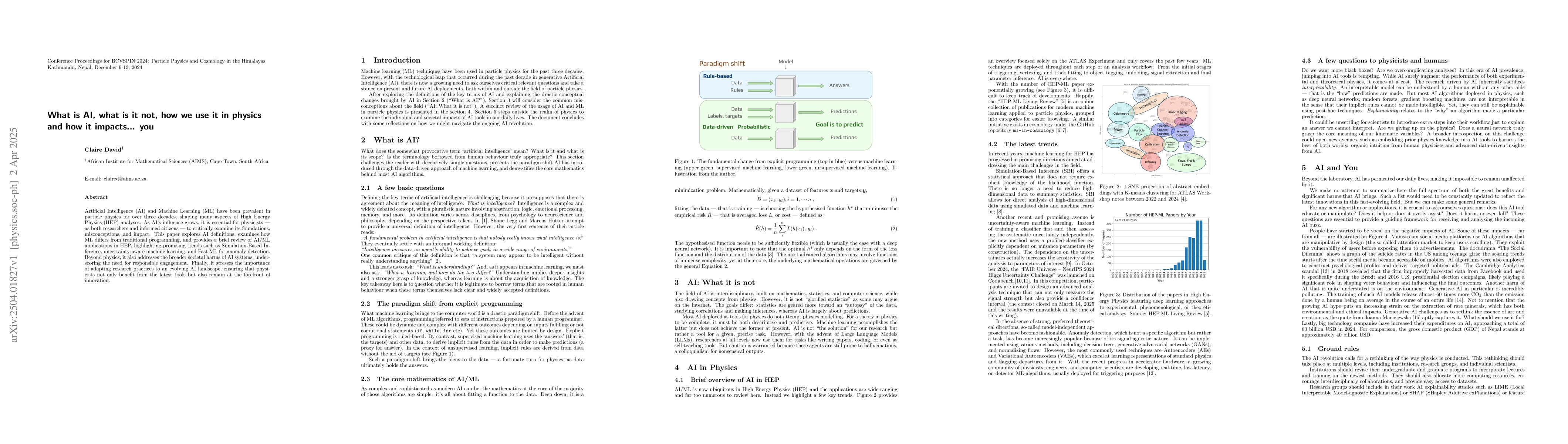The paper explores AI definitions, examines ML differences from traditional programming, and reviews AI/ML applications in HEP, focusing on Simulation-Based Inference, uncertainty-aware machine learning, and Fast ML for anomaly detection.