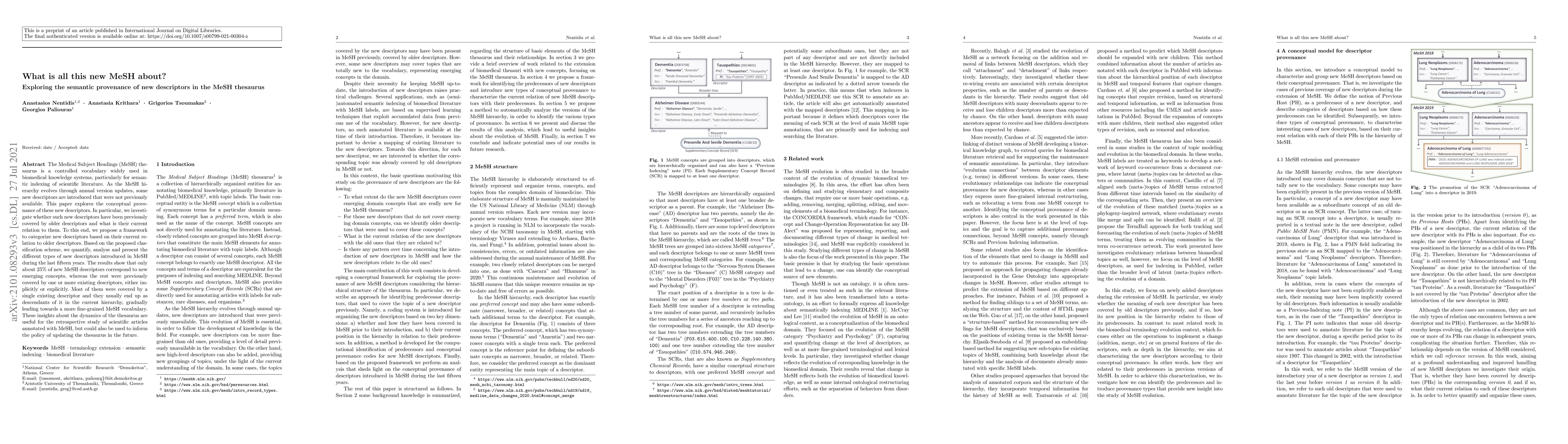 The Medical Subject Headings (MeSH) thesaurus is a controlled vocabulary widely used in biomedical knowledge systems, particularly for semantic indexing of scientific literature. As the MeSH hierarchy evolves through annual version updates, some new descriptors are introduced that were not previously available. This paper explores the conceptual provenance of these new descriptors. In particular, we investigate whether such new descriptors have been previously covered by older descriptors and what is their current relation to them. To this end, we propose a framework to categorize new descriptors based on their current relation to older descriptors. Based on the proposed classification scheme, we quantify, analyse and present the different types of new descriptors introduced in MeSH during the last fifteen years. The results show that only about 25% of new MeSH descriptors correspond to new emerging concepts, whereas the rest were previously covered by one or more existing descriptors, either implicitly or explicitly. Most of them were covered by a single existing descriptor and they usually end up as descendants of it in the current hierarchy, gradually leading towards a more fine-grained MeSH vocabulary. These insights about the dynamics of the thesaurus are useful for the retrospective study of scientific articles annotated with MeSH, but could also be used to inform the policy of updating the thesaurus in the future.