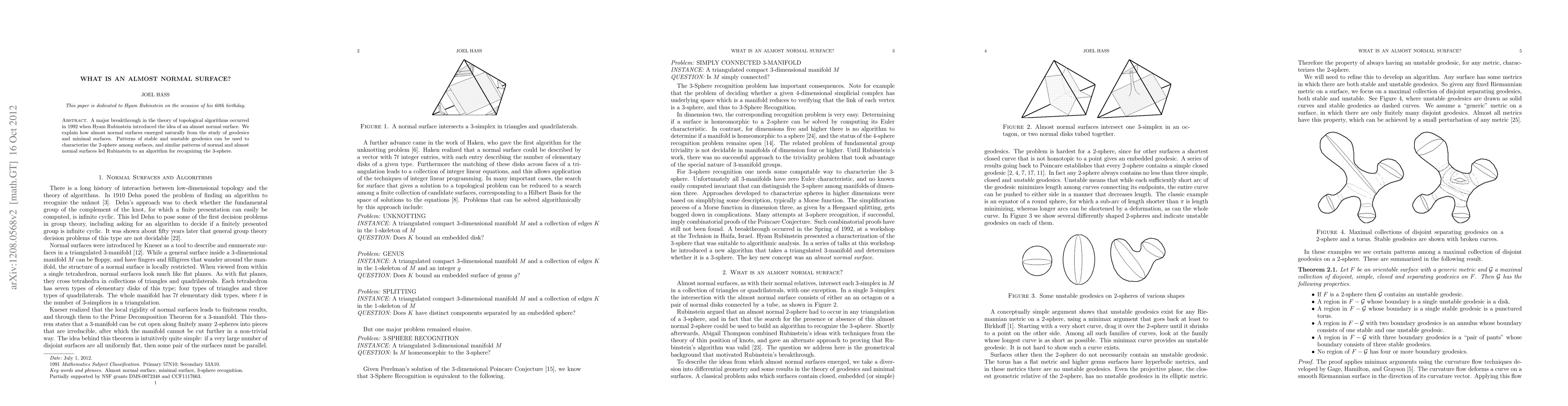 A major breakthrough in the theory of topological algorithms occurred in 1992 when Hyam Rubinstein introduced the idea of an almost normal surface. We explain how almost normal surfaces emerged naturally from the study of geodesics and minimal surfaces. Patterns of stable and unstable geodesics can be used to characterize the 2-sphere among surfaces, and similar patterns characterize the 3-sphere among 3-manifolds. Analogous patterns of normal and almost normal surfaces led Rubinstein to an algorithm for recognizing the 3-sphere.
