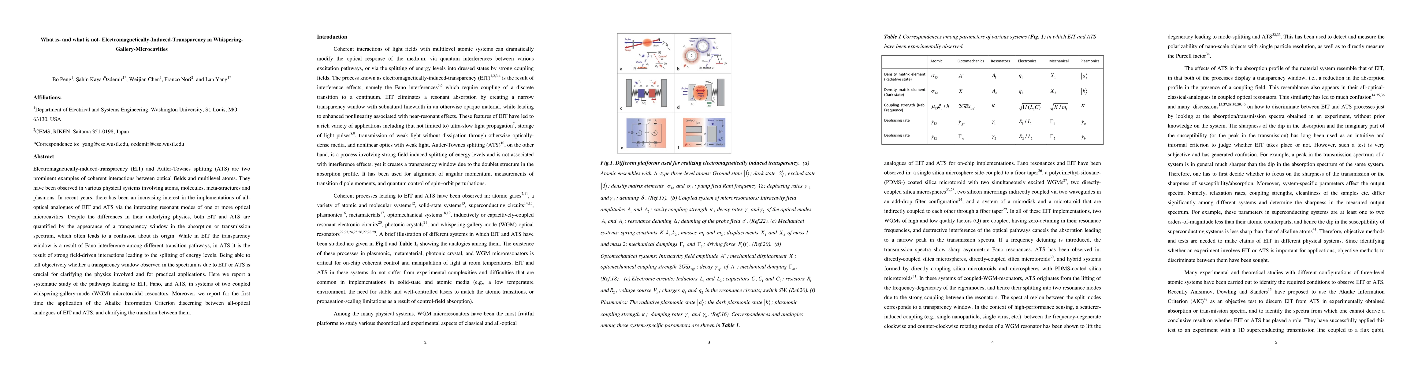 Electromagnetically-induced-transparency (EIT) and Autler-Townes splitting (ATS) are two prominent examples of coherent interactions between optical fields and multilevel atoms. They have been observed in various physical systems involving atoms, molecules, meta-structures and plasmons. In recent years, there has been an increasing interest in the implementations of all-optical analogues of EIT and ATS via the interacting resonant modes of one or more optical microcavities. Despite the differences in their underlying physics, both EIT and ATS are quantified by the appearance of a transparency window in the absorption or transmission spectrum, which often leads to a confusion about its origin. While in EIT the transparency window is a result of Fano interference among different transition pathways, in ATS it is the result of strong field-driven interactions leading to the splitting of energy levels. Being able to tell objectively whether a transparency window observed in the spectrum is due to EIT or ATS is crucial for clarifying the physics involved and for practical applications. Here we report a systematic study of the pathways leading to EIT, Fano, and ATS, in systems of two coupled whispering-gallery-mode (WGM) microtoroidal resonators. Moreover, we report for the first time the application of the Akaike Information Criterion discerning between all-optical analogues of EIT and ATS, and clarifying the transition between them.