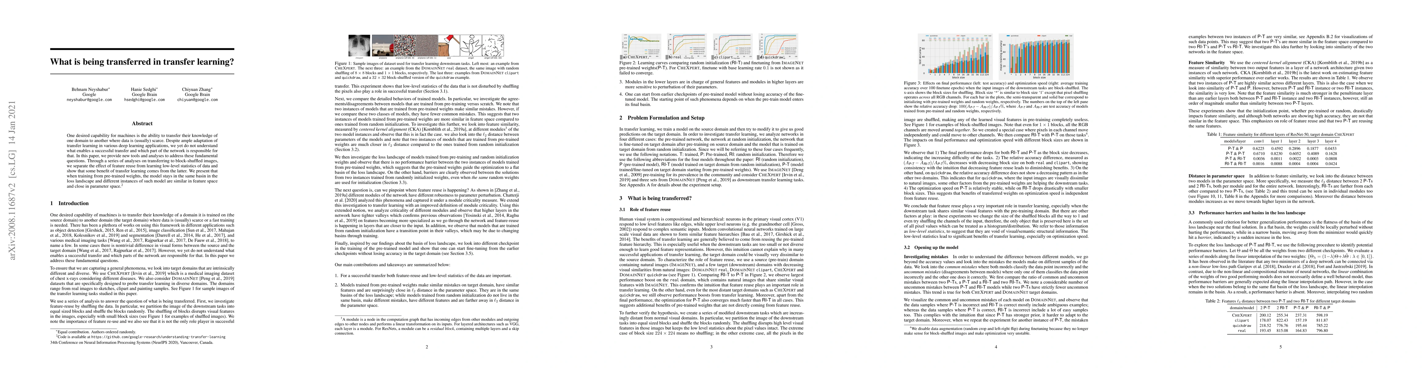 One desired capability for machines is the ability to transfer their knowledge of one domain to another where data is (usually) scarce. Despite ample adaptation of transfer learning in various deep learning applications, we yet do not understand what enables a successful transfer and which part of the network is responsible for that. In this paper, we provide new tools and analyses to address these fundamental questions. Through a series of analyses on transferring to block-shuffled images, we separate the effect of feature reuse from learning low-level statistics of data and show that some benefit of transfer learning comes from the latter. We present that when training from pre-trained weights, the model stays in the same basin in the loss landscape and different instances of such model are similar in feature space and close in parameter space.
