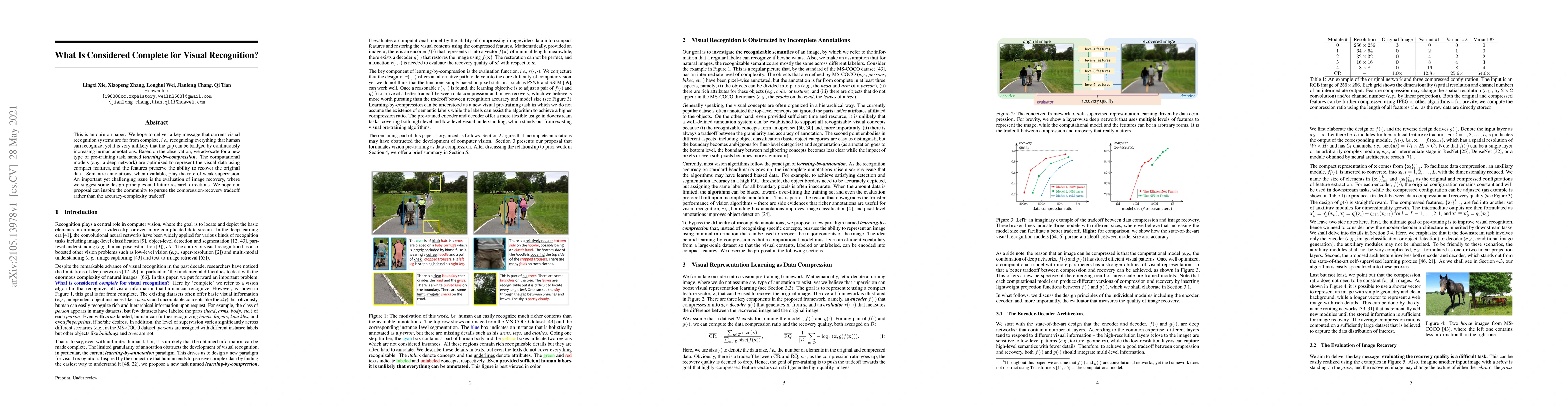 This is an opinion paper. We hope to deliver a key message that current visual recognition systems are far from complete, i.e., recognizing everything that human can recognize, yet it is very unlikely that the gap can be bridged by continuously increasing human annotations. Based on the observation, we advocate for a new type of pre-training task named learning-by-compression. The computational models (e.g., a deep network) are optimized to represent the visual data using compact features, and the features preserve the ability to recover the original data. Semantic annotations, when available, play the role of weak supervision. An important yet challenging issue is the evaluation of image recovery, where we suggest some design principles and future research directions. We hope our proposal can inspire the community to pursue the compression-recovery tradeoff rather than the accuracy-complexity tradeoff.