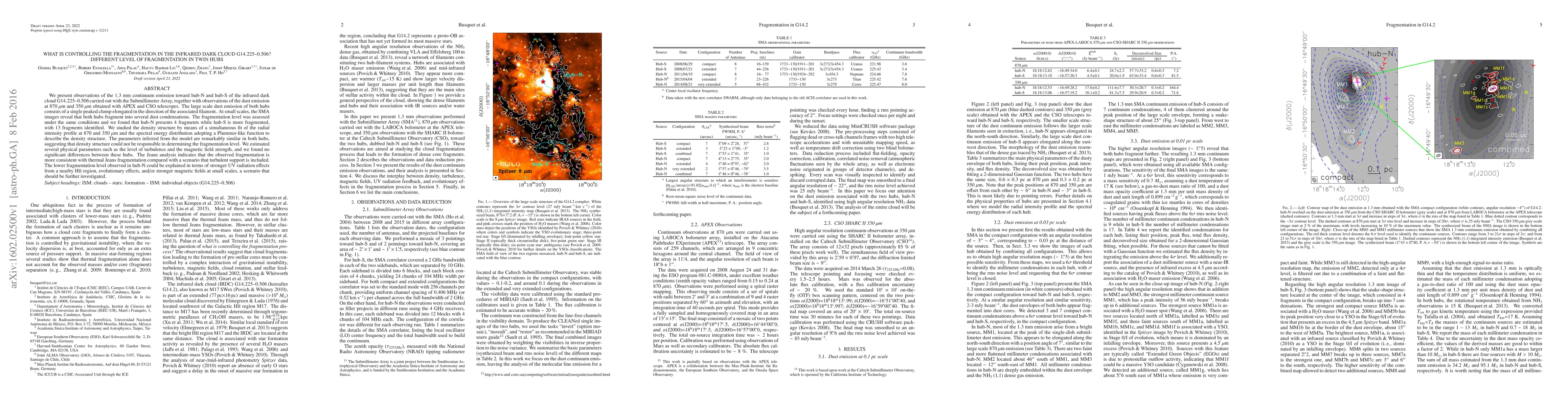We present observations of the 1.3 mm continuum emission toward hub-N and hub-S of the infrared dark cloud G14.225-0.506 carried out with the Submillimeter Array, together with observations of the dust emission at 870 and 350 microns obtained with APEX and CSO telescopes. The large scale dust emission of both hubs consists of a single peaked clump elongated in the direction of the associated filament. At small scales, the SMA images reveal that both hubs fragment into several dust condensations. The fragmentation level was assessed under the same conditions and we found that hub-N presents 4 fragments while hub-S is more fragmented, with 13 fragments identified. We studied the density structure by means of a simultaneous fit of the radial intensity profile at 870 and 350 microns and the spectral energy distribution adopting a Plummer-like function to describe the density structure. The parameters inferred from the model are remarkably similar in both hubs, suggesting that density structure could not be responsible in determining the fragmentation level. We estimated several physical parameters such as the level of turbulence and the magnetic field strength, and we found no significant differences between these hubs. The Jeans analysis indicates that the observed fragmentation is more consistent with thermal Jeans fragmentation compared with a scenario that turbulent support is included. The lower fragmentation level observed in hub-N could be explained in terms of stronger UV radiation effects from a nearby HII region, evolutionary effects, and/or stronger magnetic fields at small scales, a scenario that should be further investigated.