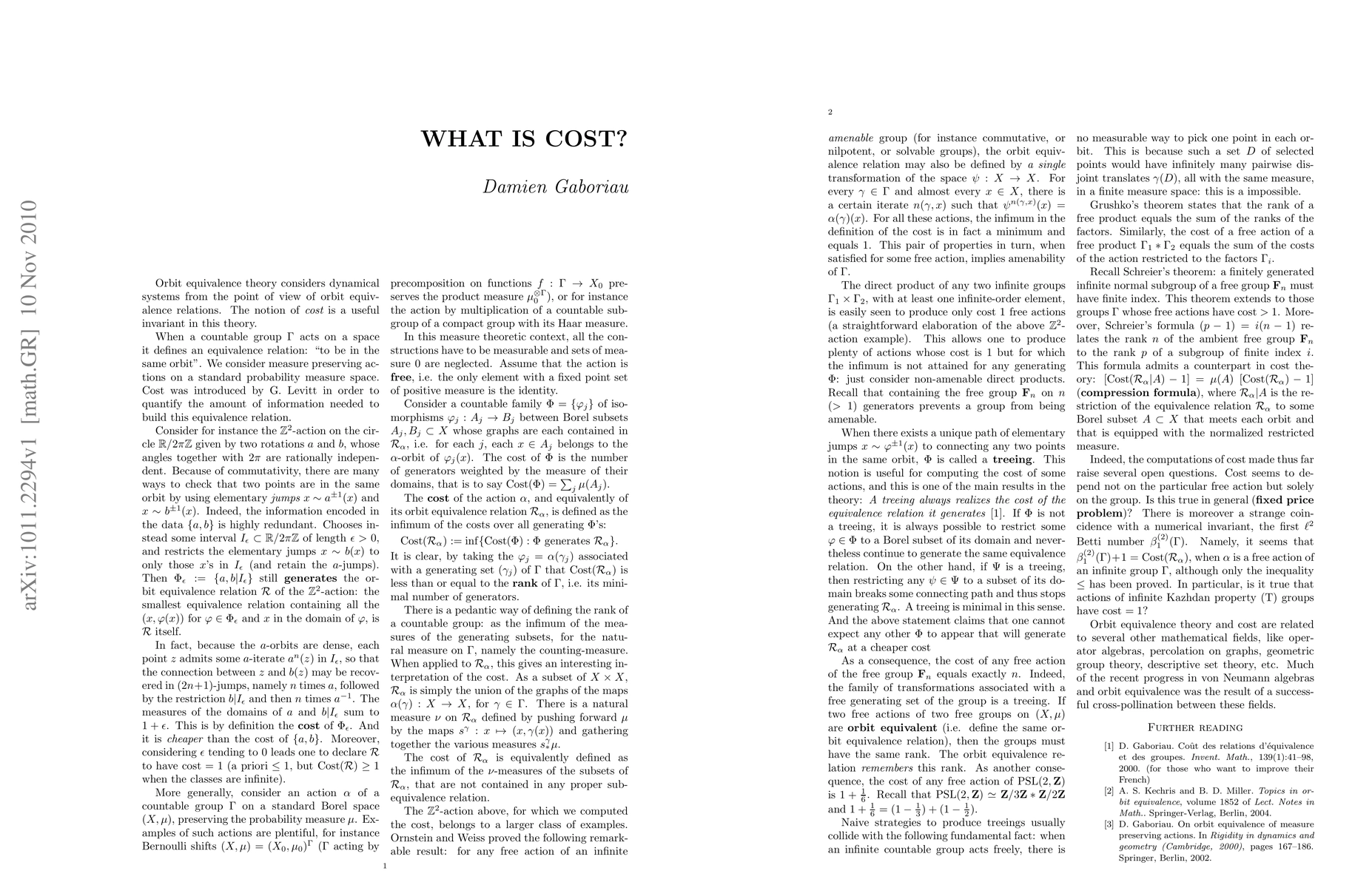 Summary: This two-page paper explores the concept of "cost" in the context of group theory, specifically examining how cost functions relate to measured equivalence relations, aiming to clarify the underlying mathematical principles for a broader audience in the "What is?" series of the Notices of the AMS.
