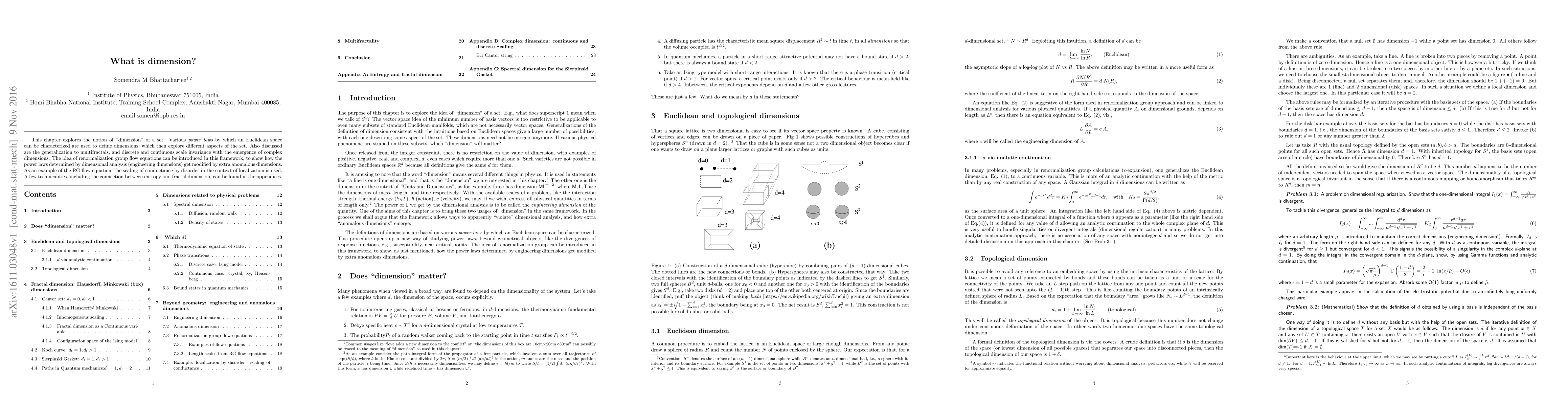 This chapter explores the notion of "dimension" of a set. Various power laws by which an Euclidean space can be characterized are used to define dimensions, which then explore different aspects of the set. Also discussed are the generalization to multifractals, and discrete and continuous scale invariance with the emergence of complex dimensions. The idea of renormalization group flow equations can be introduced in this framework, to show how the power laws determined by dimensional analysis (engineering dimensions) get modified by extra anomalous dimensions. As an example of the RG flow equation, the scaling of conductance by disorder in the context of localization is used. A few technicalities, including the connection between entropy and fractal dimension, can be found in the appendices.