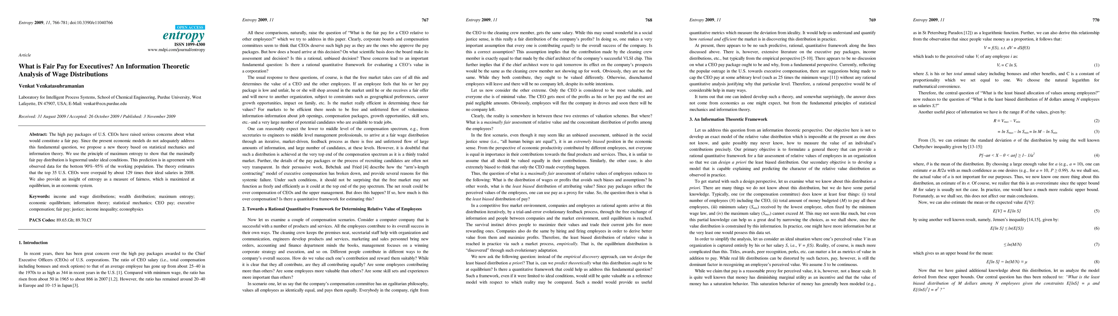 Summary: This paper explores the concept of fair pay for U.S. CEOs through an information theoretic lens, questioning the ethical justifications for their substantial wage packages amidst growing public concern. The study aims to provide a framework for evaluating executive compensation fairness.
