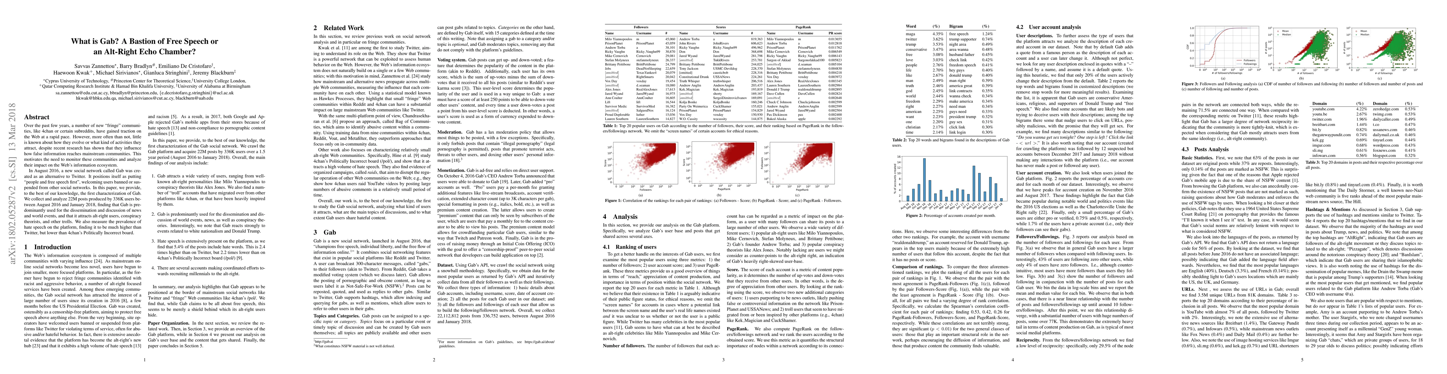 Over the past few years, a number of new "fringe" communities, like 4chan or certain subreddits, have gained traction on the Web at a rapid pace. However, more often than not, little is known about how they evolve or what kind of activities they attract, despite recent research has shown that they influence how false information reaches mainstream communities. This motivates the need to monitor these communities and analyze their impact on the Web's information ecosystem. In August 2016, a new social network called Gab was created as an alternative to Twitter. It positions itself as putting "people and free speech first'", welcoming users banned or suspended from other social networks. In this paper, we provide, to the best of our knowledge, the first characterization of Gab. We collect and analyze 22M posts produced by 336K users between August 2016 and January 2018, finding that Gab is predominantly used for the dissemination and discussion of news and world events, and that it attracts alt-right users, conspiracy theorists, and other trolls. We also measure the prevalence of hate speech on the platform, finding it to be much higher than Twitter, but lower than 4chan's Politically Incorrect board.