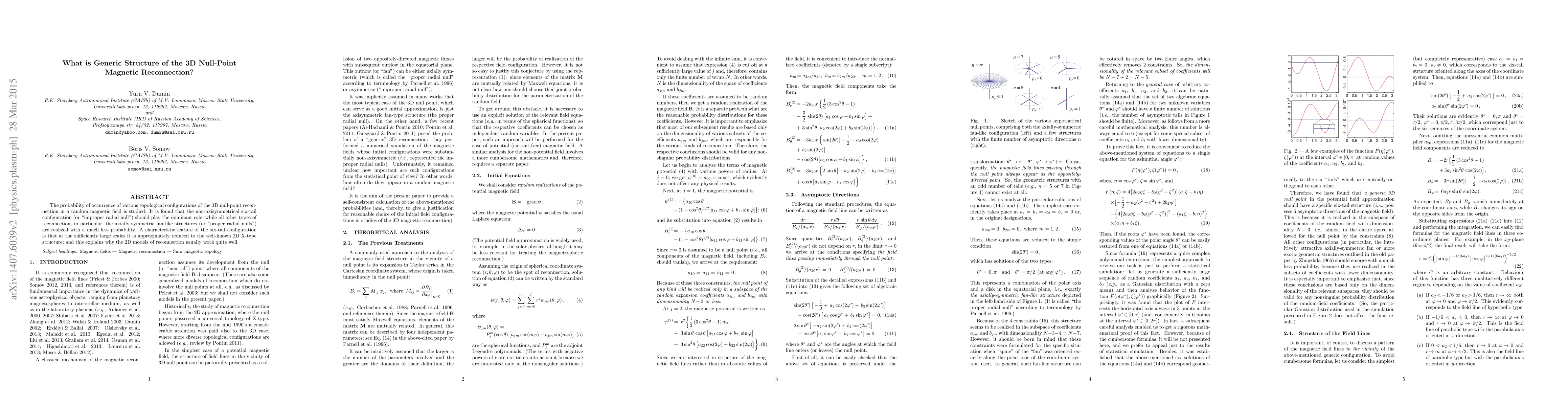 The probability of occurrence of various topological configurations of the 3D null-point reconnection in a random magnetic field is studied. It is found that the non-axisymmetrical six-tail configuration (or "improper radial null") should play the dominant role; while all other types of reconnection, in particular, the axially-symmetric fan-like structures (or "proper radial nulls") are realized with a much less probability. A characteristic feature of the six-tail configuration is that at the sufficiently large scales it is approximately reduced to the well-known 2D X-type structure; and this explains why the 2D models of reconnection usually work quite well.