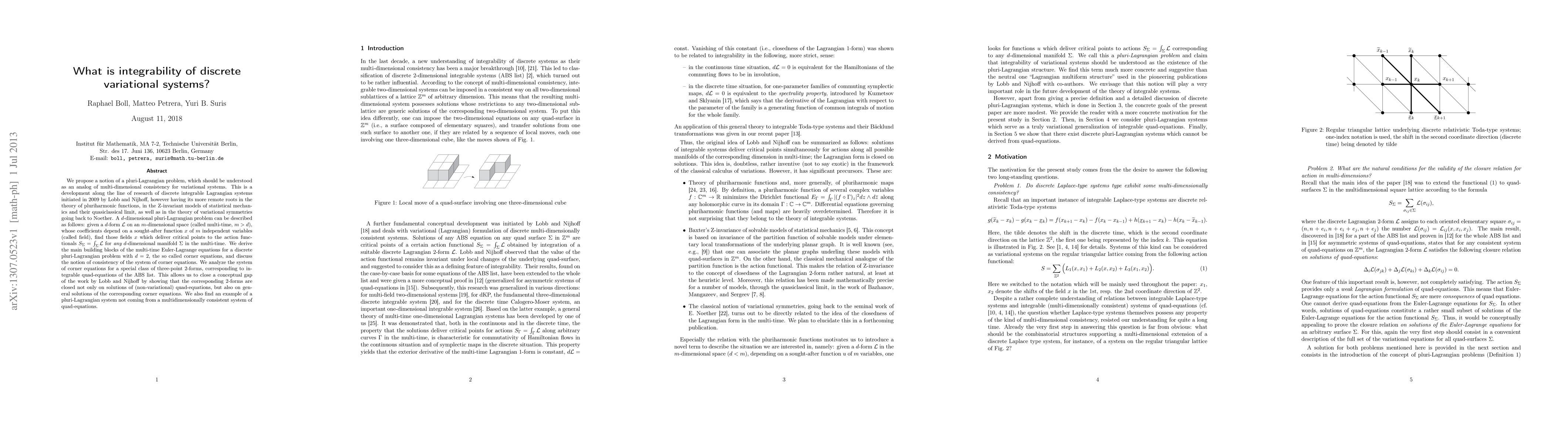 We propose a notion of a pluri-Lagrangian problem, which should be understood as an analog of multi-dimensional consistency for variational systems. This is a development along the line of research of discrete integrable Lagrangian systems initiated in 2009 by Lobb and Nijhoff, however having its more remote roots in the theory of pluriharmonic functions, in the Z-invariant models of statistical mechanics and their quasiclassical limit, as well as in the theory of variational symmetries going back to Noether. A d-dimensional pluri-Lagrangian problem can be described as follows: given a d-form L on an m-dimensional space (called multi-time, m>d), whose coefficients depend on a sought-after function x of m independent variables (called field), find those fields x which deliver critical points to the action functionals $S_{\Sigma}=\int_{\Sigma} L$ for any d-dimensional manifold $\Sigma$ in the multi-time. We derive the main building blocks of the multi-time Euler-Lagrange equations for a discrete pluri-Lagrangian problem with d=2, the so called corner equations, and discuss the notion of consistency of the system of corner equations. We analyze the system of corner equations for a special class of three-point 2-forms, corresponding to integrable quad-equations of the ABS list. This allows us to close a conceptual gap of the work by Lobb and Nijhoff by showing that the corresponding 2-forms are closed not only on solutions of (non-variational) quad-equations, but also on general solutions of the corresponding corner equations. We also find an example of a pluri-Lagrangian system not coming from a multidimensionally consistent system of quad-equations.