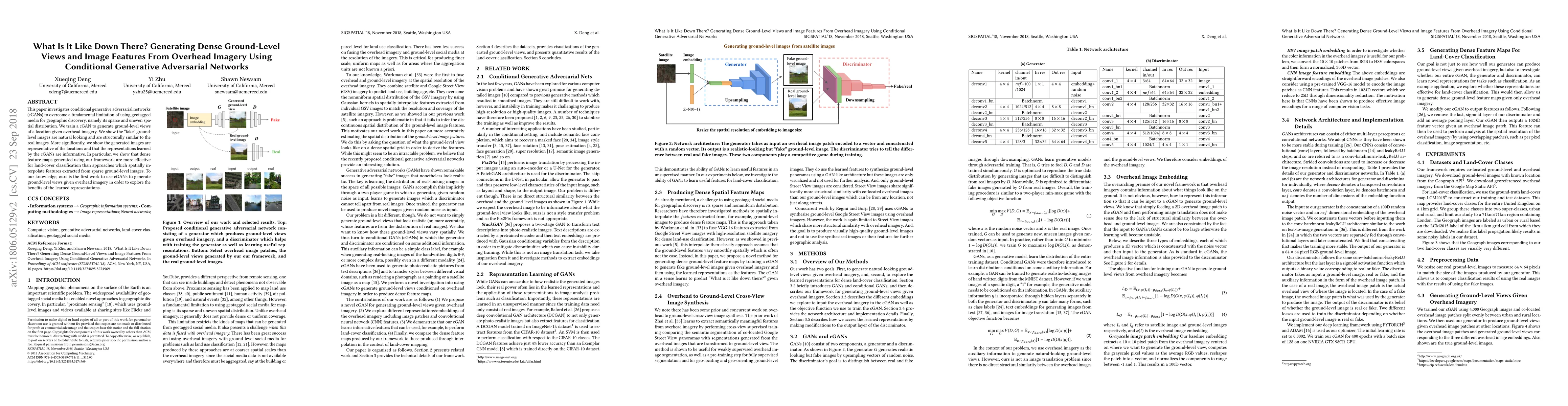 This paper employs conditional generative adversarial networks (cGANs) to generate realistic ground-level views from overhead imagery, addressing the sparse distribution of geotagged media. The generated images are shown to be effective for land-cover classification, outperforming methods that interpolate features from sparse ground-level images.