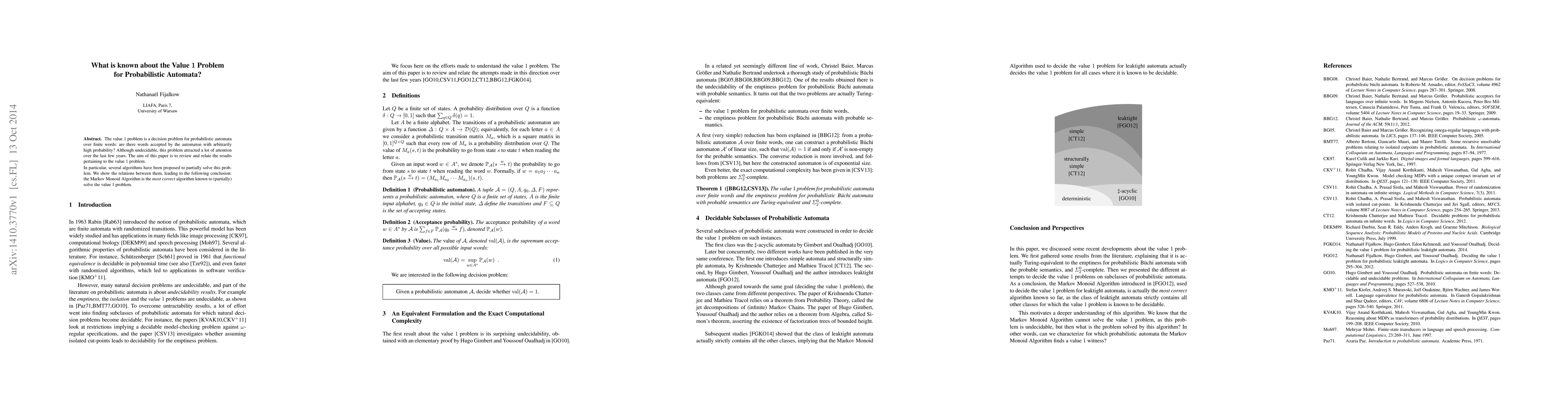 The research paper reviews and relates recent results on the value 1 problem for probabilistic automata over finite words.