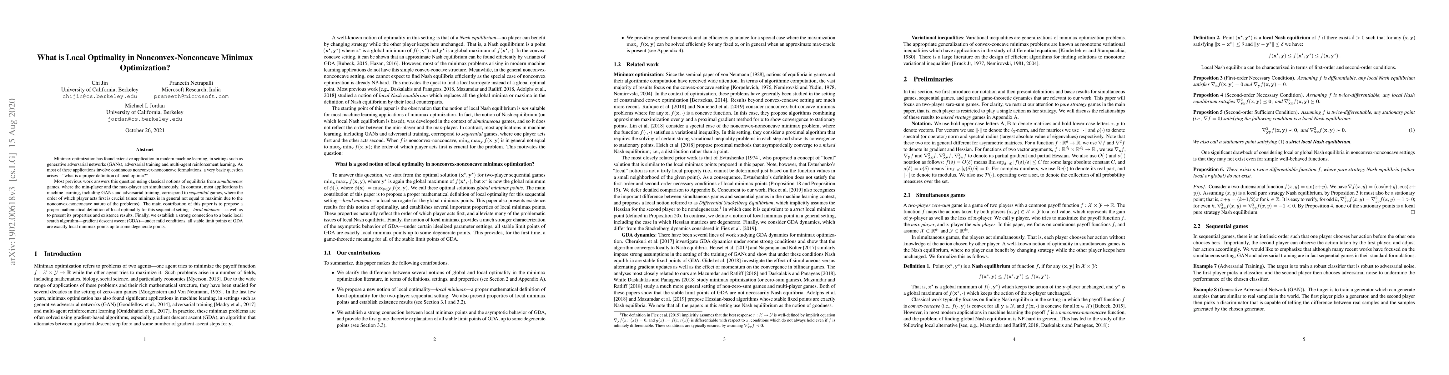 This paper proposes a mathematical definition of local optimality for nonconvex-nonconcave minimax optimization in sequential settings, such as those found in machine learning applications. It establishes the concept of local minimax and shows that gradient descent ascent converges to these points under certain conditions.