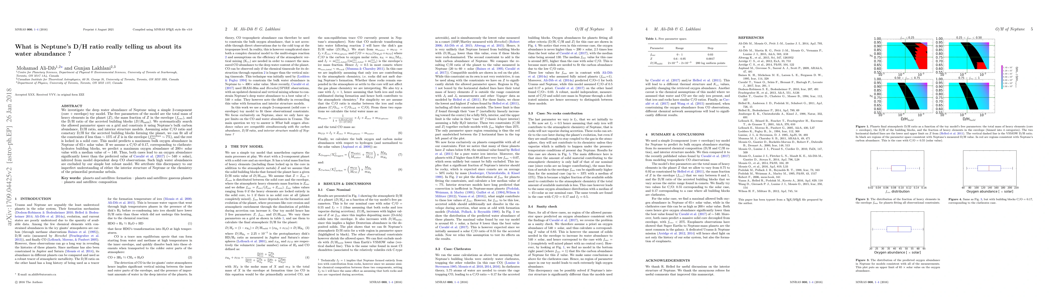 We investigate the deep water abundance of Neptune using a simple 2-component (core + envelope) toy model. The free parameters of the model are the total mass of heavy elements in the planet (Z), the mass fraction of Z in the envelope (f_env), and the D/H ratio of the accreted building blocks (D/H_build ). We systematically search the allowed parameter space on a grid and constrain it using Neptune's bulk carbon abundance, D/H ratio, and interior structure models. Assuming solar C/O ratio and cometary D/H for the accreted building blocks forming the planet, we can fit all of median ~ 7%), and the rest the constraints if less than ~ 15% of Z is in the envelope (f_env is locked in a solid core. This model predicts a maximum bulk oxygen abundance in Neptune of 65 \times solar value. If we assume a C/O of 0.17, corresponding to clathrate-hydrates building blocks, we predict a maximum oxygen abundance of 200 times solar value with a median value of ~ 140. Thus, both cases lead to an oxygen abundance significantly lower than the preferred value of Cavali\'e et al. (2017) (~ 540 times solar), inferred from model dependent deep CO observations. Such high water abundances are excluded by our simple but robust model. We attribute this discrepancy to our imperfect understanding of either the interior structure of Neptune or the chemistry of the primordial protosolar nebula.