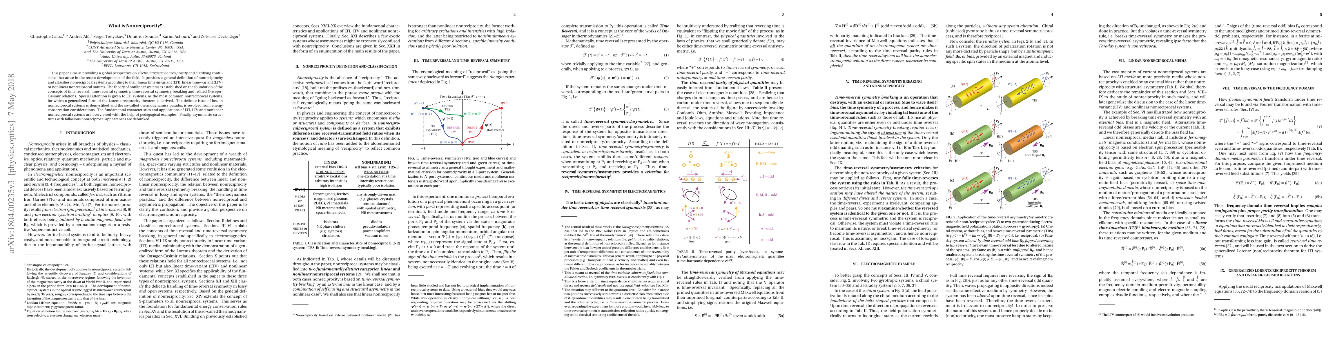 This paper aims at providing a global perspective on electromagnetic nonreciprocity and clarifying confusions that arose in the recent developments of the field. It provides a general definition of nonreciprocity and classifies nonreciprocal systems according to their linear time-invariant (LTI), linear time-variant (LTV) or nonlinear nonreciprocal natures. The theory of nonlinear systems is established on the foundation of the concepts of time reversal, time-reversal symmetry, time-reversal symmetry breaking and related Onsager- Casimir relations. Special attention is given to LTI systems, as the most common nonreciprocal systems, for which a generalized form of the Lorentz reciprocity theorem is derived. The delicate issue of loss in nonreciprocal systems is demystified and the so-called thermodynamics paradox is resolved from energy conservation considerations. The fundamental characteristics and applications of LTI, LTV and nonlinear nonreciprocal systems are overviewed with the help of pedagogical examples. Finally, asymmetric structures with fallacious nonreciprocal appearances are debunked.