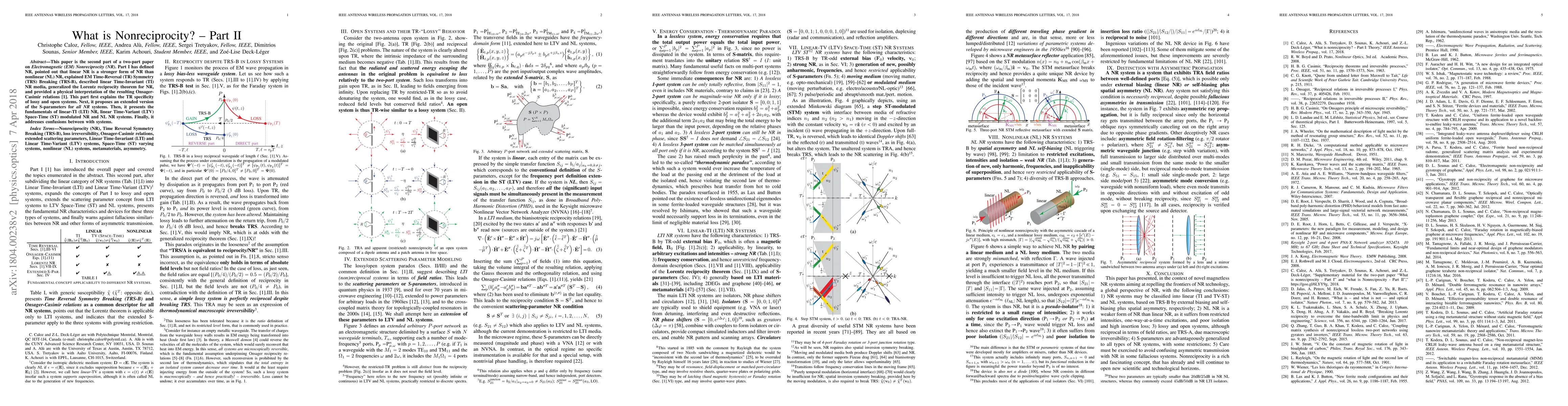 This paper is the second part of a two-part paper on \emph{Electromagnetic (EM) Nonreciprocity (NR)}. Part~I has defined NR, pointed out that linear NR is a stronger form of NR than nonlinear (NL) NR, explained EM Time-Reversal (TR) Symmetry (TRS) Breaking (TRS-B), described linear Time-Invariant (TI) NR media, generalized the Lorentz reciprocity theorem for NR, and provided a physical interpretation of the resulting Onsager-Casimir relations~\cite{Caloz_AWPL_NR_I_2018}. This part first explains the TR specificity of lossy and open systems. Next, it proposes an extended version of the S-parameters for \emph{all NR} systems. Then, it presents the fundamentals of linear-TI (LTI) NR, linear Time-Variant (LTV) Space-Time (ST) modulated NR and NL NR systems. Finally, it addresses confusions between with systems.