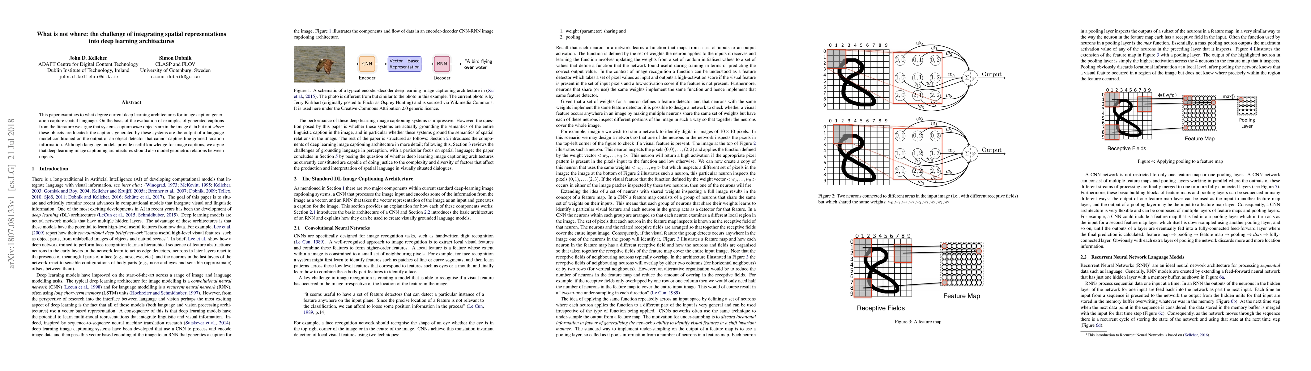 This paper examines to what degree current deep learning architectures for image caption generation capture spatial language. On the basis of the evaluation of examples of generated captions from the literature we argue that systems capture what objects are in the image data but not where these objects are located: the captions generated by these systems are the output of a language model conditioned on the output of an object detector that cannot capture fine-grained location information. Although language models provide useful knowledge for image captions, we argue that deep learning image captioning architectures should also model geometric relations between objects.