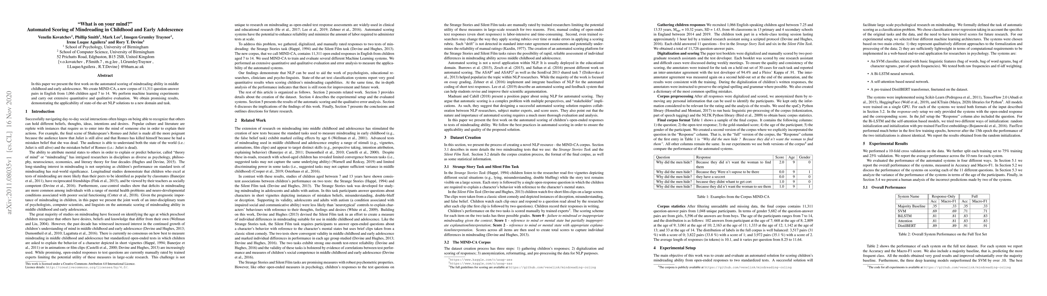 In this paper we present the first work on the automated scoring of mindreading ability in middle childhood and early adolescence. We create MIND-CA, a new corpus of 11,311 question-answer pairs in English from 1,066 children aged 7 to 14. We perform machine learning experiments and carry out extensive quantitative and qualitative evaluation. We obtain promising results, demonstrating the applicability of state-of-the-art NLP solutions to a new domain and task.