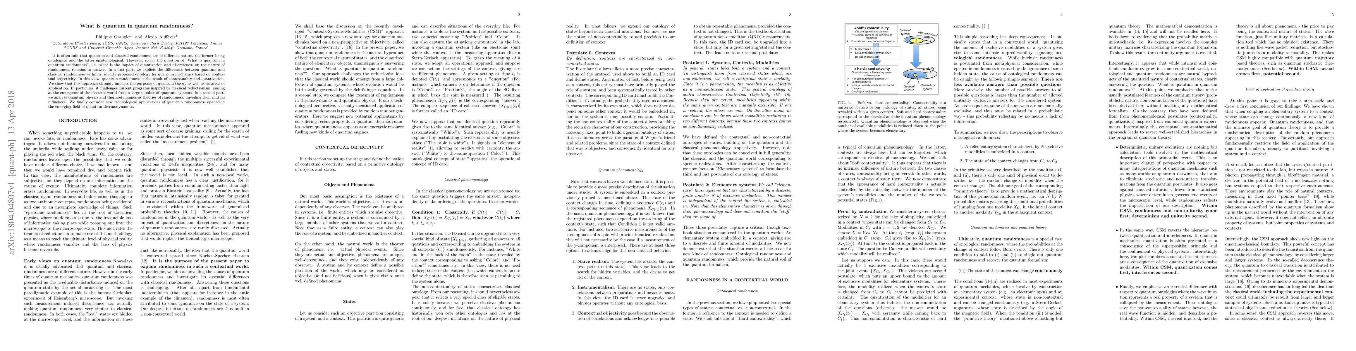 It is often said that quantum and classical randomness are of different nature, the former being ontological and the latter epistemological. However, so far the question of "What is quantum in quantum randomness", i.e. what is the impact of quantization and discreteness on the nature of randomness, remains to answer. In a first part, we explicit the differences between quantum and classical randomness within a recently proposed ontology for quantum mechanics based on contextual objectivity. In this view, quantum randomness is the result of contextuality and quantization. We show that this approach strongly impacts the purposes of quantum theory as well as its areas of application. In particular, it challenges current programs inspired by classical reductionism, aiming at the emergence of the classical world from a large number of quantum systems. In a second part, we analyze quantum physics and thermodynamics as theories of randomness, unveiling their mutual influences. We finally consider new technological applications of quantum randomness opened in the emerging field of quantum thermodynamics.