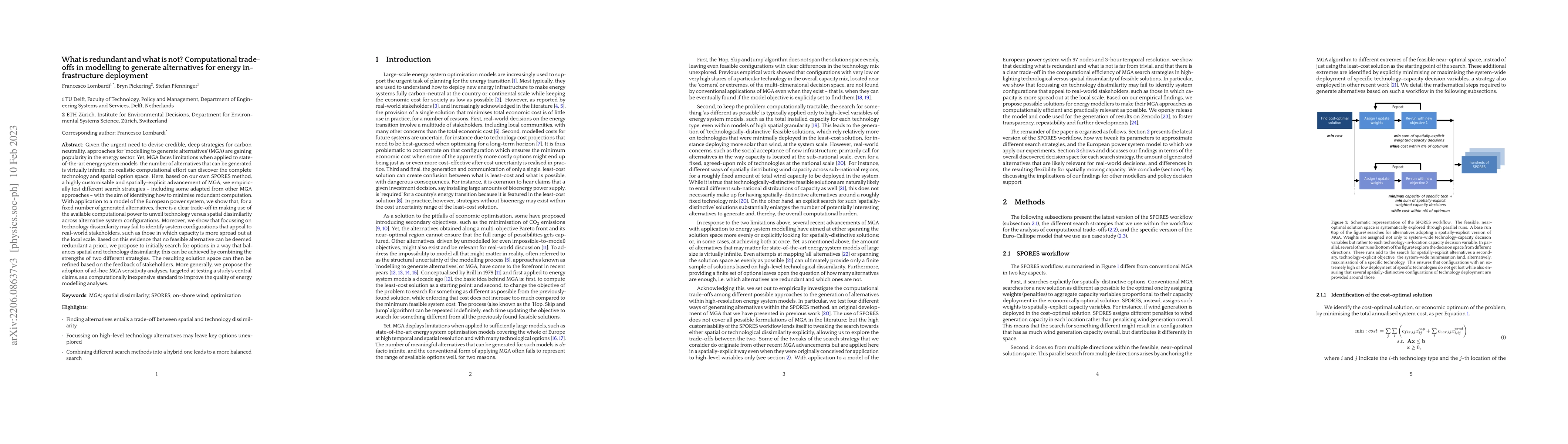This paper investigates computational trade-offs in modelling to generate alternatives for energy infrastructure deployment, focusing on minimising redundant computation. It proposes a hybrid search strategy combining technology and spatial diversity to balance the exploration of alternatives, demonstrating that no feasible alternative can be deemed redundant without empirical testing.