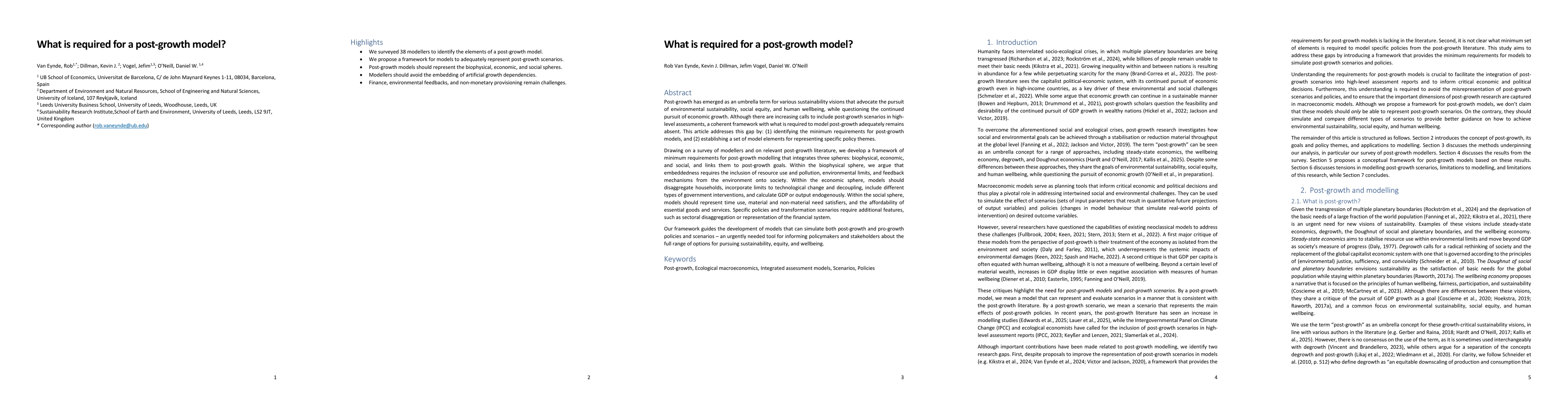 Post-growth has emerged as an umbrella term for various sustainability visions that advocate the pursuit of environmental sustainability, social equity, and human wellbeing, while questioning the continued pursuit of economic growth. Although there are increasing calls to include post-growth scenarios in high-level assessments, a coherent framework with what is required to model post-growth adequately remains absent. This article addresses this gap by: (1) identifying the minimum requirements for post-growth models, and (2) establishing a set of model elements for representing specific policy themes. Drawing on a survey of modellers and on relevant post-growth literature, we develop a framework of minimum requirements for post-growth modelling that integrates three spheres: biophysical, economic, and social, and links them to post-growth goals. Within the biophysical sphere, we argue that embeddedness requires the inclusion of resource use and pollution, environmental limits, and feedback mechanisms from the environment onto society. Within the economic sphere, models should disaggregate households, incorporate limits to technological change and decoupling, include different types of government interventions, and calculate GDP or output endogenously. Within the social sphere, models should represent time use, material and non-material need satisfiers, and the affordability of essential goods and services. Specific policies and transformation scenarios require additional features, such as sectoral disaggregation or representation of the financial system. Our framework guides the development of models that can simulate both post-growth and pro-growth policies and scenarios, an urgently needed tool for informing policymakers and stakeholders about the full range of options for pursuing sustainability, equity, and wellbeing.
