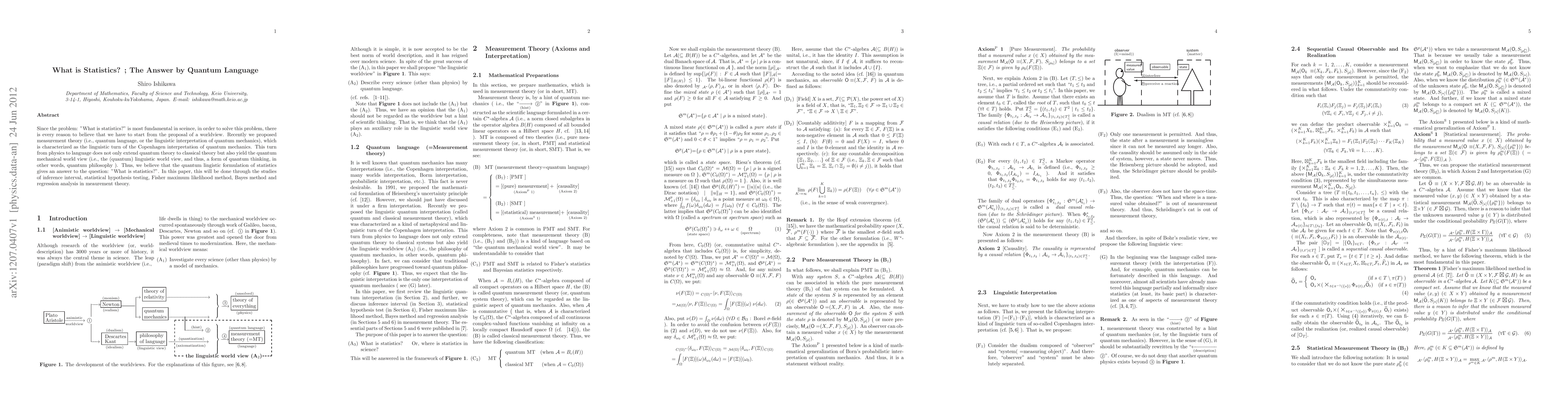 Since the problem: "What is statistics?" is most fundamental in sceince, in order to solve this problem, there is every reason to believe that we have to start from the proposal of a worldview. Recently we proposed measurement theory (i.e., quantum language, or the linguistic interpretation of quantum mechanics), which is characterized as the linguistic turn of the Copenhagen interpretation of quantum mechanics. This turn from physics to language does not only extend quantum theory to classical theory but also yield the quantum mechanical world view (i.e., the (quantum) linguistic world view, and thus, a form of quantum thinking, in other words, quantum philosophy). Thus, we believe that the quantum lingistic formulation of statistics gives an answer to the question: "What is statistics?". In this paper, this will be done through the studies of inference interval, statistical hypothesis testing, Fisher maximum likelihood method, Bayes method and regression analysis in meaurement theory.
