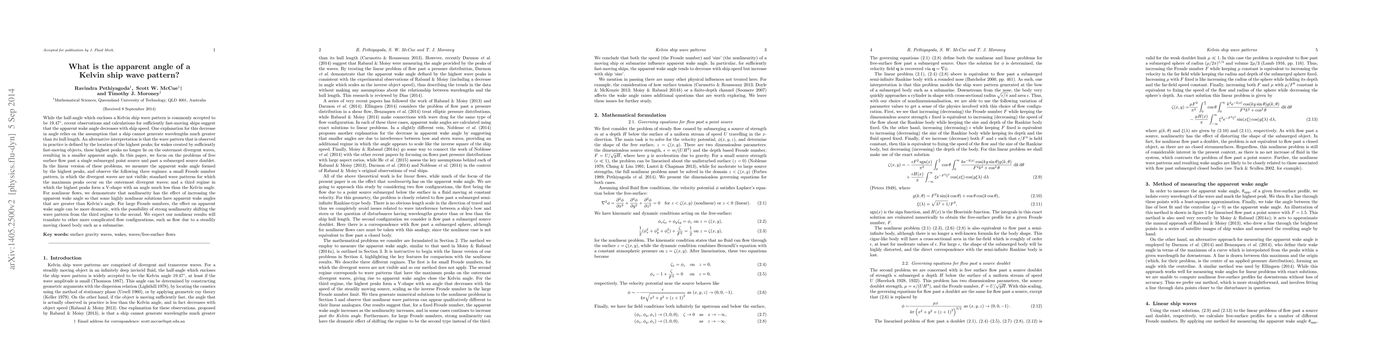 While the half-angle which encloses a Kelvin ship wave pattern is commonly accepted to be 19.47 degrees, recent observations and calculations for sufficiently fast-moving ships suggest that the apparent wake angle decreases with ship speed. One explanation for this decrease in angle relies on the assumption that a ship cannot generate wavelengths much greater than its hull length. An alternative interpretation is that the wave pattern that is observed in practice is defined by the location of the highest peaks; for wakes created by sufficiently fast-moving objects, these highest peaks no longer lie on the outermost divergent waves, resulting in a smaller apparent angle. In this paper, we focus on the problems of free surface flow past a single submerged point source and past a submerged source doublet. In the linear version of these problems, we measure the apparent wake angle formed by the highest peaks, and observe the following three regimes: a small Froude number pattern, in which the divergent waves are not visible; standard wave patterns for which the maximum peaks occur on the outermost divergent waves; and a third regime in which the highest peaks form a V-shape with an angle much less than the Kelvin angle. For nonlinear flows, we demonstrate that nonlinearity has the effect of increasing the apparent wake angle so that some highly nonlinear solutions have apparent wake angles that are greater than Kelvin's angle. For large Froude numbers, the effect on apparent wake angle can be more dramatic, with the possibility of strong nonlinearity shifting the wave pattern from the third regime to the second. We expect our nonlinear results will translate to other more complicated flow configurations, such as flow due to a steadily moving closed body such as a submarine.