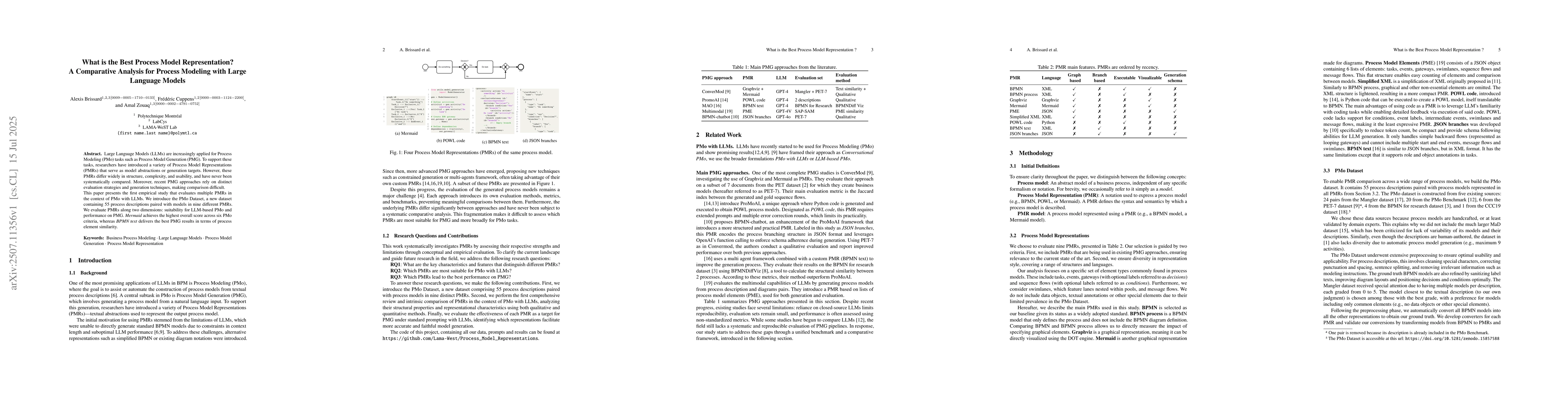 Large Language Models (LLMs) are increasingly applied for Process Modeling (PMo) tasks such as Process Model Generation (PMG). To support these tasks, researchers have introduced a variety of Process Model Representations (PMRs) that serve as model abstractions or generation targets. However, these PMRs differ widely in structure, complexity, and usability, and have never been systematically compared. Moreover, recent PMG approaches rely on distinct evaluation strategies and generation techniques, making comparison difficult. This paper presents the first empirical study that evaluates multiple PMRs in the context of PMo with LLMs. We introduce the PMo Dataset, a new dataset containing 55 process descriptions paired with models in nine different PMRs. We evaluate PMRs along two dimensions: suitability for LLM-based PMo and performance on PMG. \textit{Mermaid} achieves the highest overall score across six PMo criteria, whereas \textit{BPMN text} delivers the best PMG results in terms of process element similarity.