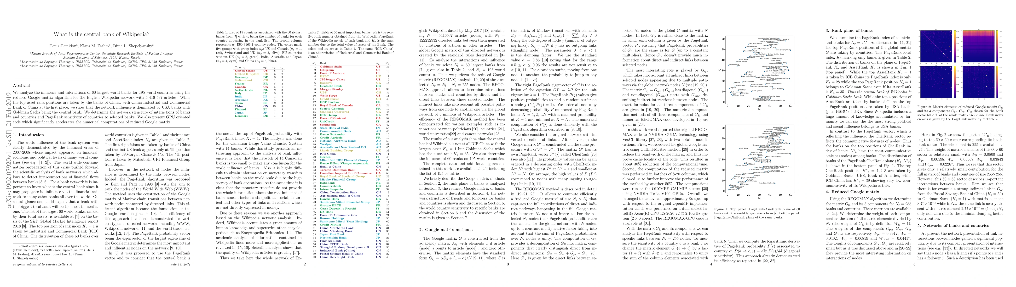 We analyze the influence and interactions of 60 largest world banks for 195 world countries using the reduced Google matrix algorithm for the English Wikipedia network with 5 416 537 articles. While the top asset rank positions are taken by the banks of China, with China Industrial and Commercial Bank of China at the first place, we show that the network influence is dominated by USA banks with Goldman Sachs being the central bank. We determine the network structure of interactions of banks and countries and PageRank sensitivity of countries to selected banks. We also present GPU oriented code which significantly accelerates the numerical computations of reduced Google matrix.
