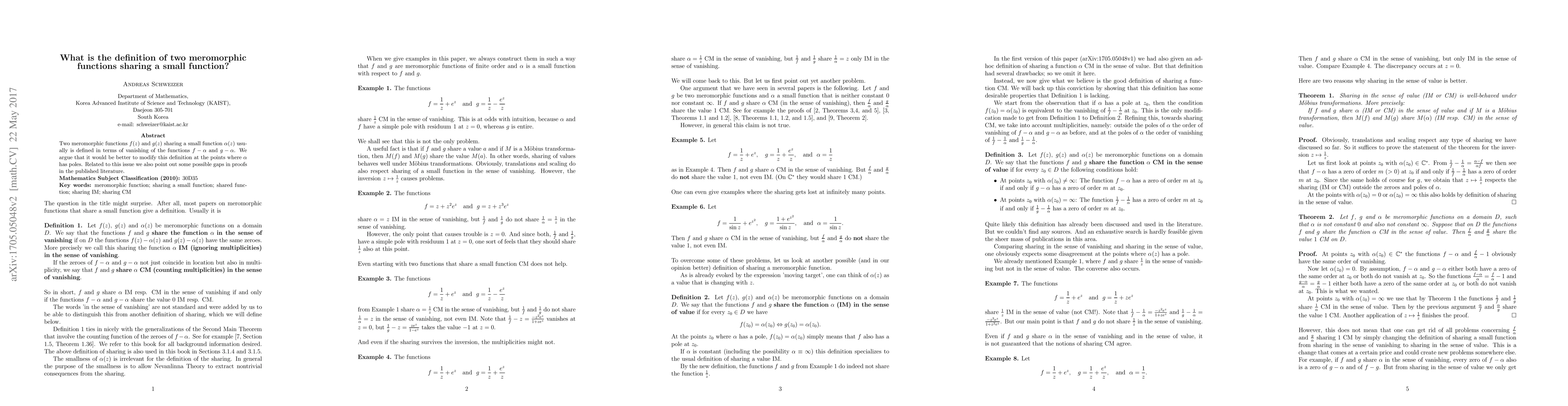 Summary: The paper proposes a refined definition for two meromorphic functions sharing a small function by adjusting the current definition at points where the small function has poles, and also identifies potential gaps in existing proofs on this topic.