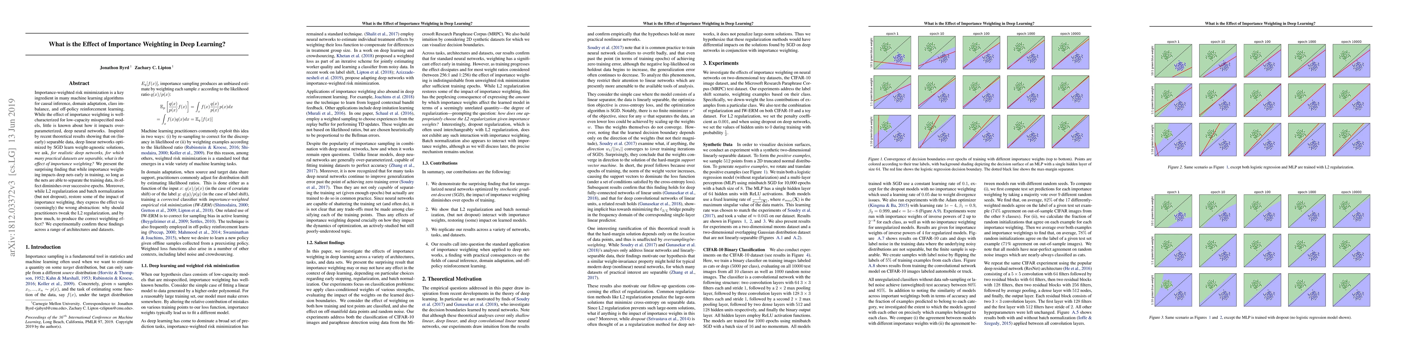 Importance-weighted risk minimization is a key ingredient in many machine learning algorithms for causal inference, domain adaptation, class imbalance, and off-policy reinforcement learning. While the effect of importance weighting is well-characterized for low-capacity misspecified models, little is known about how it impacts over-parameterized, deep neural networks. This work is inspired by recent theoretical results showing that on (linearly) separable data, deep linear networks optimized by SGD learn weight-agnostic solutions, prompting us to ask, for realistic deep networks, for which many practical datasets are separable, what is the effect of importance weighting? We present the surprising finding that while importance weighting impacts models early in training, its effect diminishes over successive epochs. Moreover, while L2 regularization and batch normalization (but not dropout), restore some of the impact of importance weighting, they express the effect via (seemingly) the wrong abstraction: why should practitioners tweak the L2 regularization, and by how much, to produce the correct weighting effect? Our experiments confirm these findings across a range of architectures and datasets.