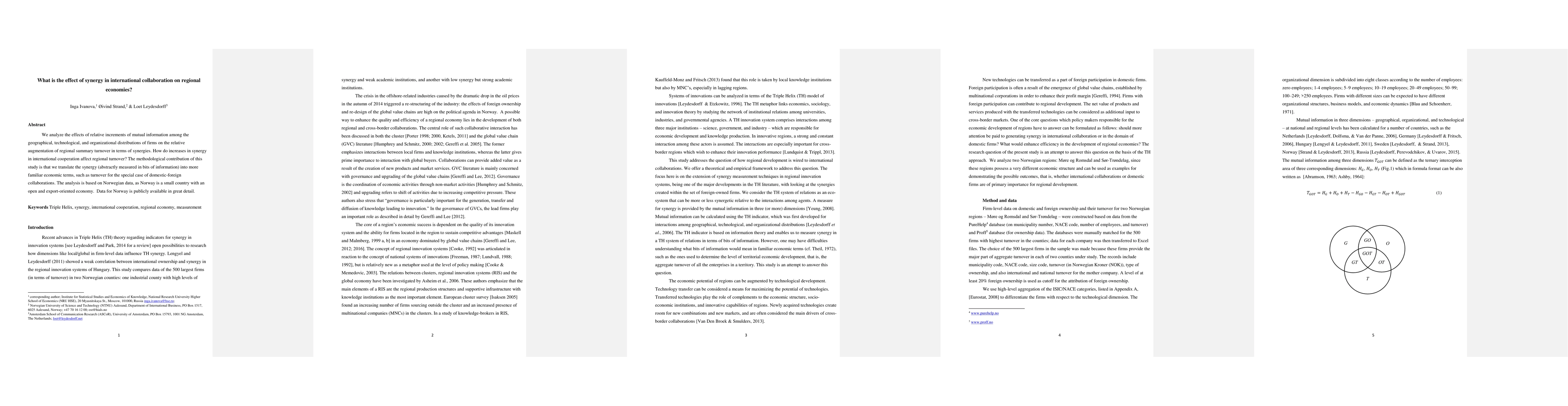 We analyze the effects of relative increments of mutual information among the geographical, technological, and organizational distributions of firms on the relative augmentation of regional summary turnover in terms of synergies. How do increases in synergy in international cooperation affect regional turnover? The methodological contribution of this study is that we translate the synergy (abstractly measured in bits of information) into more familiar economic terms, such as turnover for the special case of domestic-foreign collaborations. The analysis is based on Norwegian data, as Norway is a small country with an open and export-oriented economy. Data for Norway is publicly available in great detail.