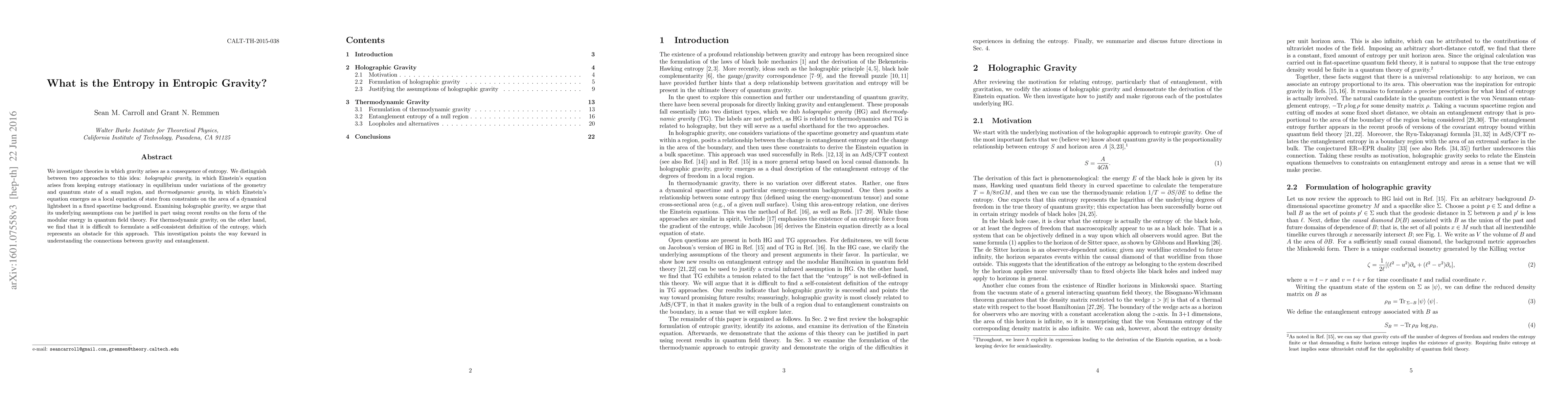 This paper explores theories where gravity emerges from entropy, distinguishing between holographic gravity and thermodynamic gravity. Holographic gravity's assumptions are partially justified by recent quantum field theory results, while thermodynamic gravity struggles with a self-consistent entropy definition.