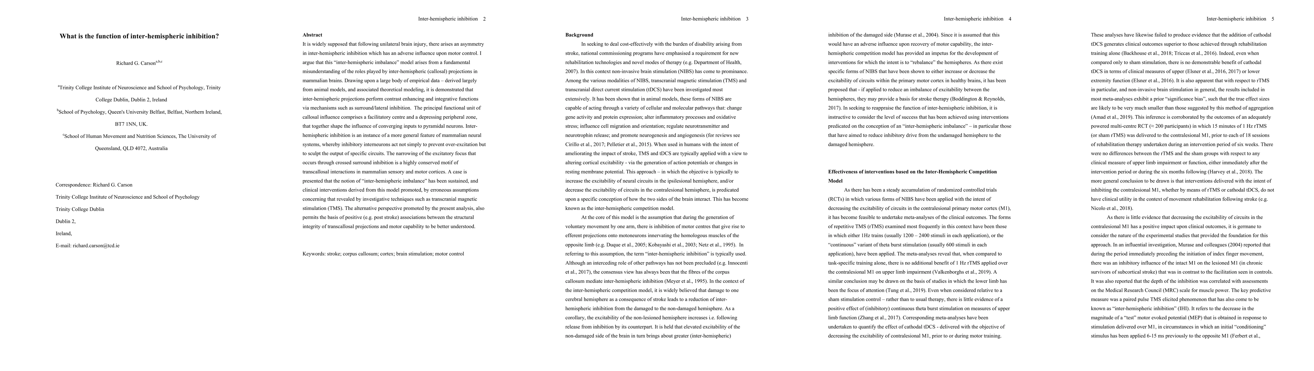 It is widely supposed that following unilateral brain injury, there arises an asymmetry in inter-hemispheric inhibition which has an adverse influence upon motor control. I argue that this 'inter-hemispheric imbalance' model arises from a fundamental misunderstanding of the roles played by inter-hemispheric (callosal) projections in mammalian brains. Drawing upon a large body of empirical data, derived largely from animal models, and associated theoretical modeling, it is demonstrated that inter-hemispheric projections perform contrast enhancing and integrative functions via mechanisms such as surround/lateral inhibition. The principal functional unit of callosal influence comprises a facilitatory centre and a depressing peripheral zone, that together shape the influence of converging inputs to pyramidal neurons. Inter-hemispheric inhibition is an instance of a more general feature of mammalian neural systems, whereby inhibitory interneurons act not simply to prevent over-excitation but to sculpt the output of specific circuits. The narrowing of the excitatory focus that occurs through crossed surround inhibition is a highly conserved motif of transcallosal interactions in mammalian sensory and motor cortices. A case is presented that the notion of 'inter-hemispheric imbalance' has been sustained, and clinical interventions derived from this model promoted, by erroneous assumptions concerning that revealed by investigative techniques such as transcranial magnetic stimulation (TMS). The alternative perspective promoted by the present analysis, also permits the basis of positive (e.g. post stroke) associations between the structural integrity of transcallosal projections and motor capability to be better understood.