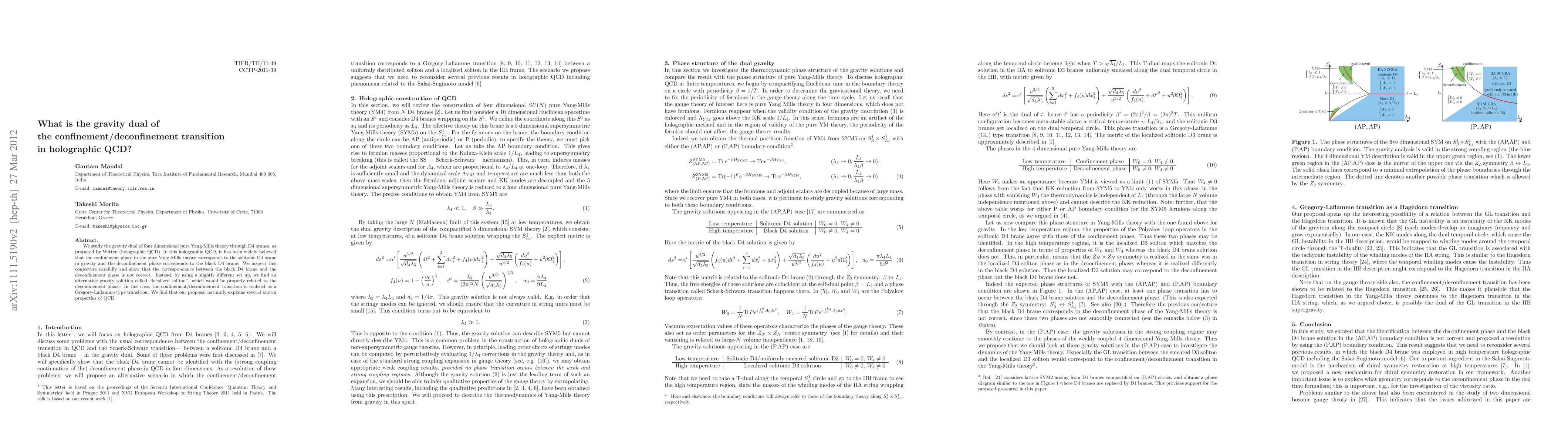 This paper investigates the gravity dual of the confinement/deconfinement transition in holographic QCD, finding that the black D4 brane does not correspond to deconfinement. Instead, a "localized soliton" solution correctly represents the deconfinement phase, leading to a Gregory-Laflamme type transition.