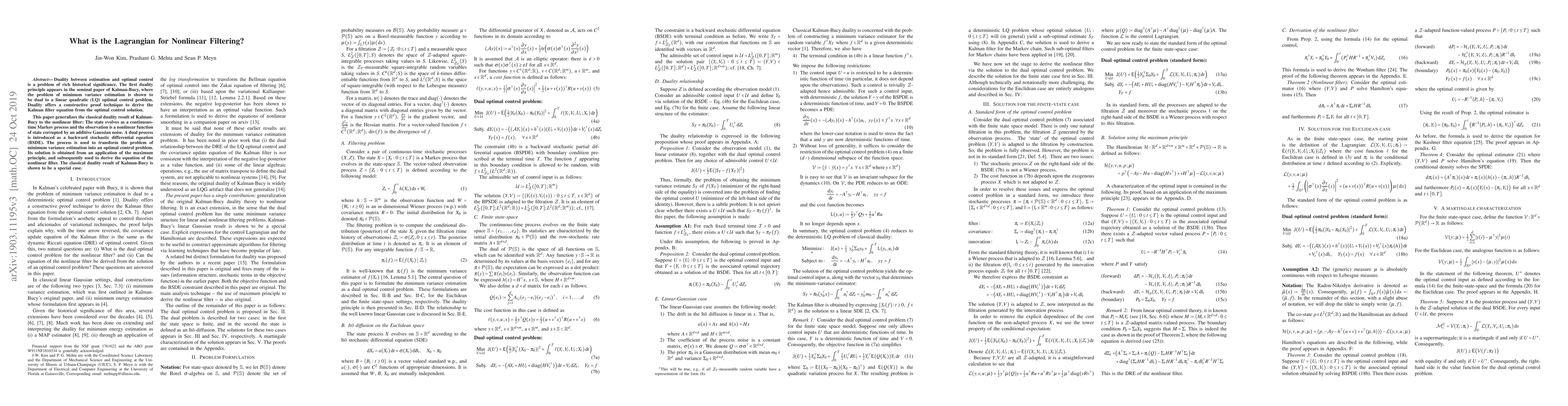 This paper establishes a duality between nonlinear filtering and optimal control, transforming the problem of minimum variance estimation into an optimal control problem using a backward stochastic differential equation. The result generalizes the classical Kalman-Bucy duality principle to nonlinear systems.