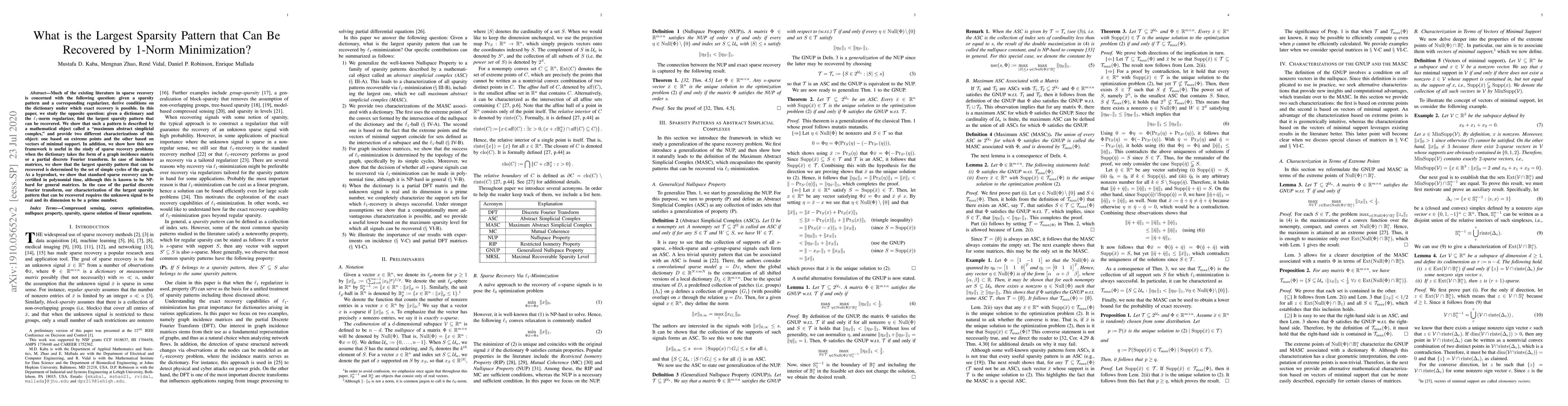 This paper explores the largest sparsity pattern recoverable via 1-norm minimization, introducing the concept of 'maximum abstract simplicial complex'. It provides two characterizations of this object and demonstrates its application in graph incidence matrices and partial discrete Fourier transforms. The study reveals that for graph incidence matrices, recoverable patterns correspond to simple cycles, and for partial DFTs, real signals of prime-dimensional space are needed. The research also offers a polynomial-time certification method for standard sparse recovery, previously considered NP-hard.