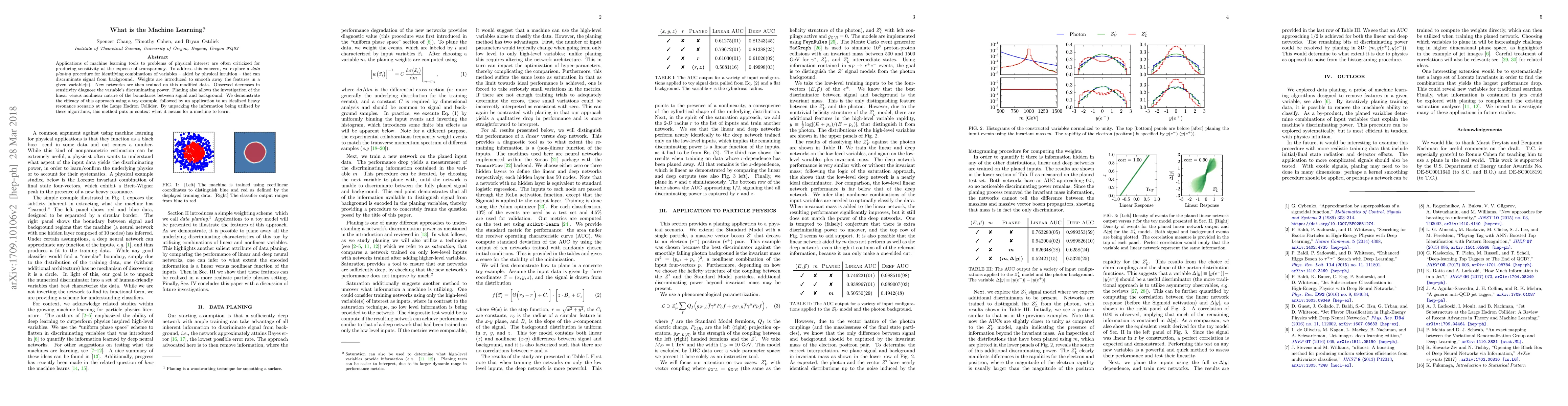 Applications of machine learning tools to problems of physical interest are often criticized for producing sensitivity at the expense of transparency. To address this concern, we explore a data planing procedure for identifying combinations of variables -- aided by physical intuition -- that can discriminate signal from background. Weights are introduced to smooth away the features in a given variable(s). New networks are then trained on this modified data. Observed decreases in sensitivity diagnose the variable's discriminating power. Planing also allows the investigation of the linear versus non-linear nature of the boundaries between signal and background. We demonstrate the efficacy of this approach using a toy example, followed by an application to an idealized heavy resonance scenario at the Large Hadron Collider. By unpacking the information being utilized by these algorithms, this method puts in context what it means for a machine to learn.